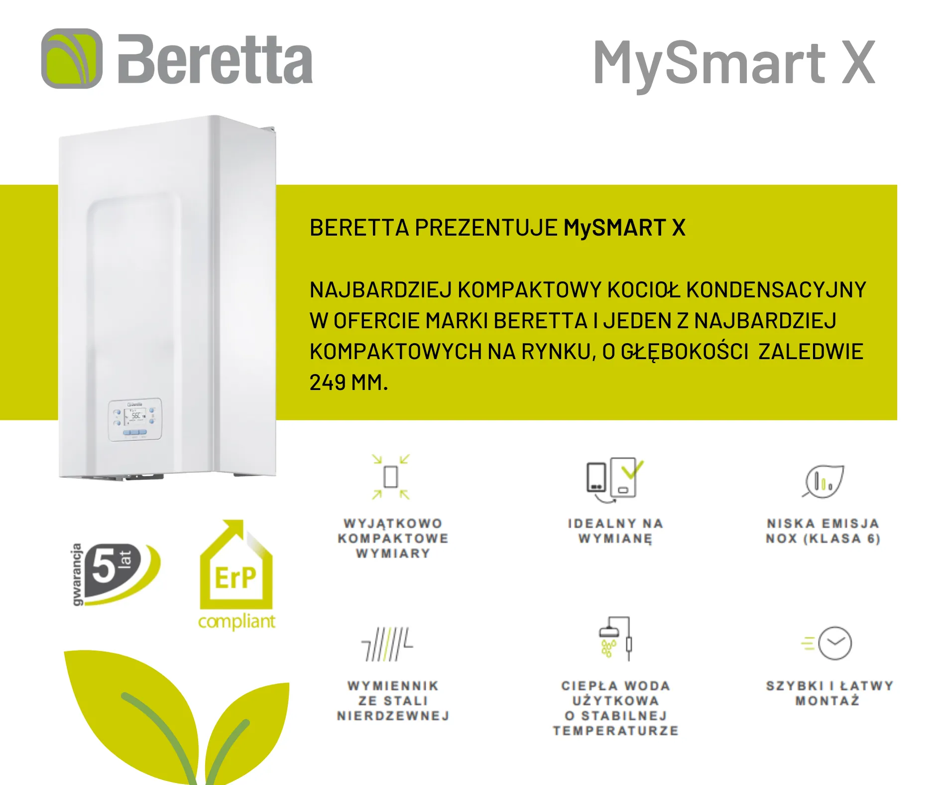 Beretta prezentuje nowy MySmart X, najbardziej kompaktowy kocioł kondensacyjny w ofercie marki beretta i jeden z najbardziej kompaktowych na rynku, o głębokości wynoszącej tylko 249 mm. Kocioł MySmart X idealnie nadaje się na wymianę, jak i do nowych instalacji.