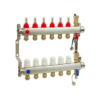 PHA-127/Z 7-obwodowy PN6 Rozdzielacz ze stali nierdzewnej do ogrzewania podłogowego z odpowietrznikiem automatycznym i złączkami 16x1/2"