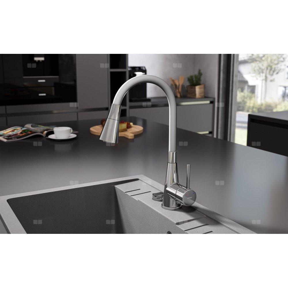 Bateria zlewozmywakowa o oryginalnym, cylindrycznym kształcie. Posiada ruchomą, elastyczną wylewkę, której kształt możemy dowolnie formować. Dzięki temu rozwiązaniu bateria staję się bardziej praktyczna oraz łatwiejsza w użytkowaniu. Dwu-funkcyjna wylewka baterii daje nam również możliwość wyboru strumienia wody.