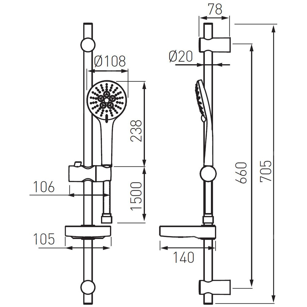 Zestaw natryskowy z 3-funkcyjną, okrągłą rączka natryskowa z możliwością wyboru typu strumienia. Praktyczna mydelniczka w komplecie. Regulacja rozstawu uchwytów mocujących, daje nam możliwość dopasowania zestawu do istniejących otworów montażowych po starym natrysku.