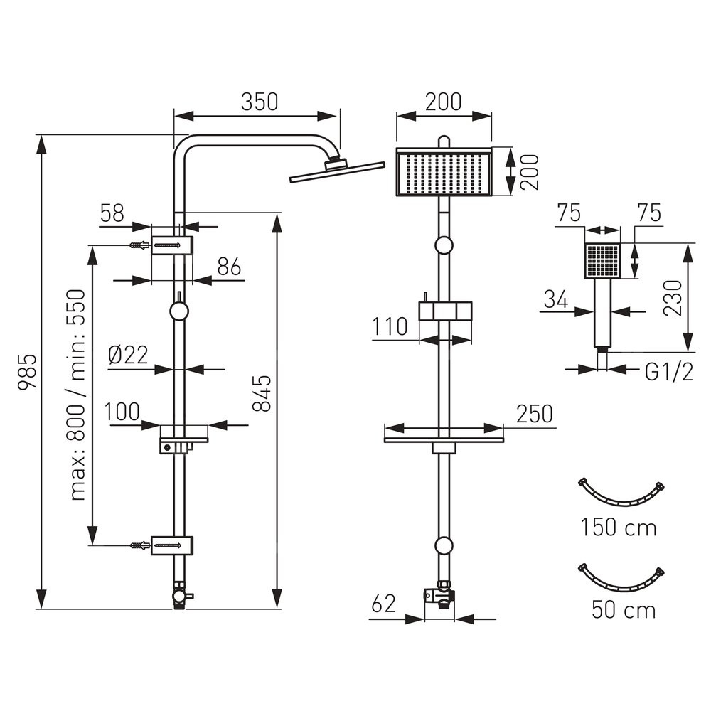 Zestaw natryskowy składający się z nowoczesnej, kwadratowej deszczownicy 20 x 20 cm, 1-funkcyjnej ergonomicznej rączki natryskowej. System Easy Clean ułatwi usuwanie osadu wapiennego z rączki i deszczowni. W zestawie znajdziemy również praktyczną półkę na kosmetyki.