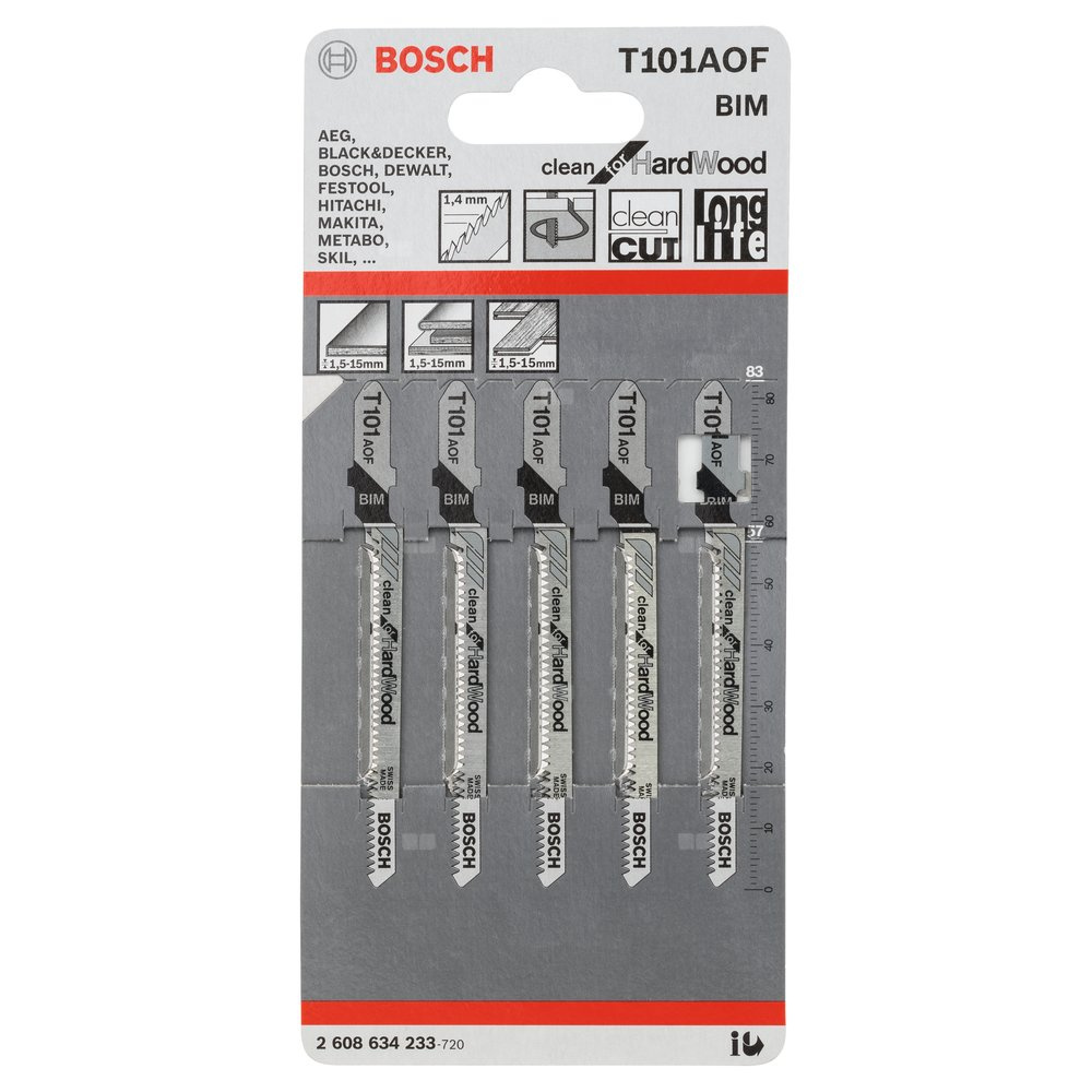 | Tekst produktu, osprzęt szary | T 101 AOF BIM, z zębami szpiczastymi, bok i zęby szlifowane Twarde drewno, laminaty (1,5-15 mm), płyty powlekane/HPL, sklejka, szczególnie do cięć krzywoliniowych, brak wyszczerbień |