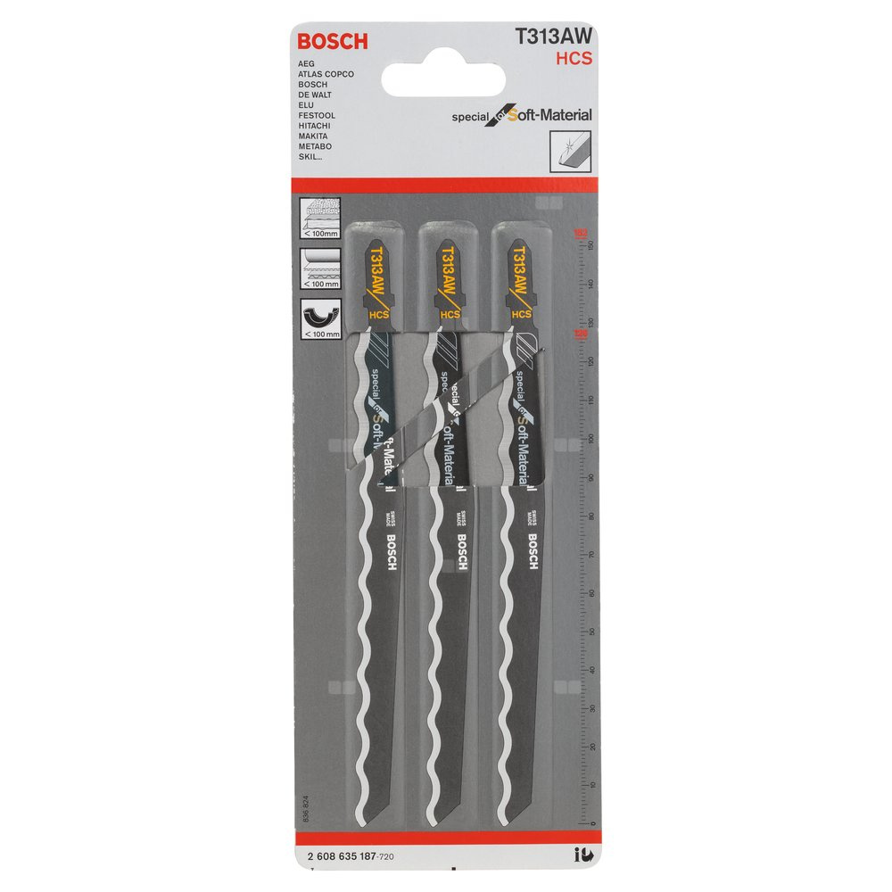 | Tekst produktu, osprzęt szary | T 313 AW HCS, noże ze szlifem falistym Karton, styropor, dywany, skóra, guma (< 100 mm) |