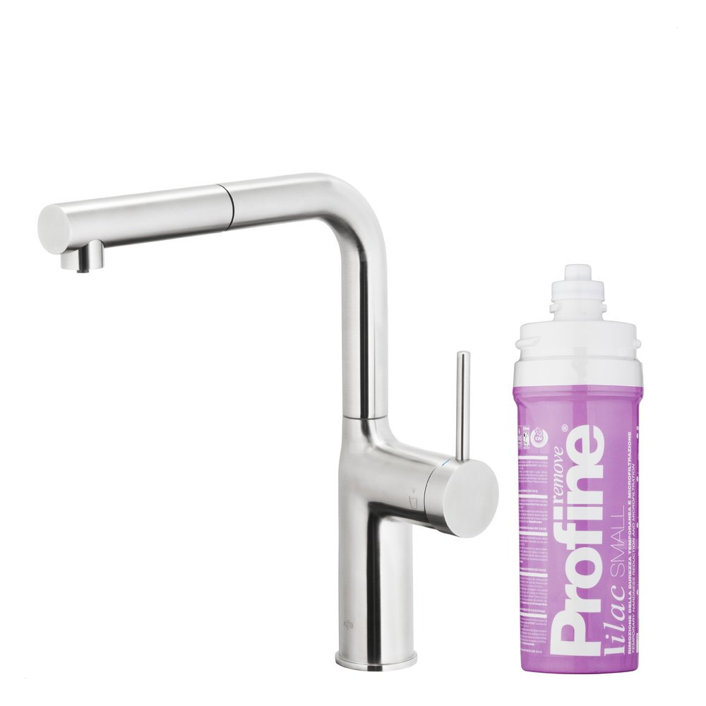 DUERO PURE MOVE PULL-OUT Bateria kuchenna z funkcją filtracji wody i wyciąganą wylewką, Stal nierdzewna + Zestaw filtrujący PROFINE Lilac S