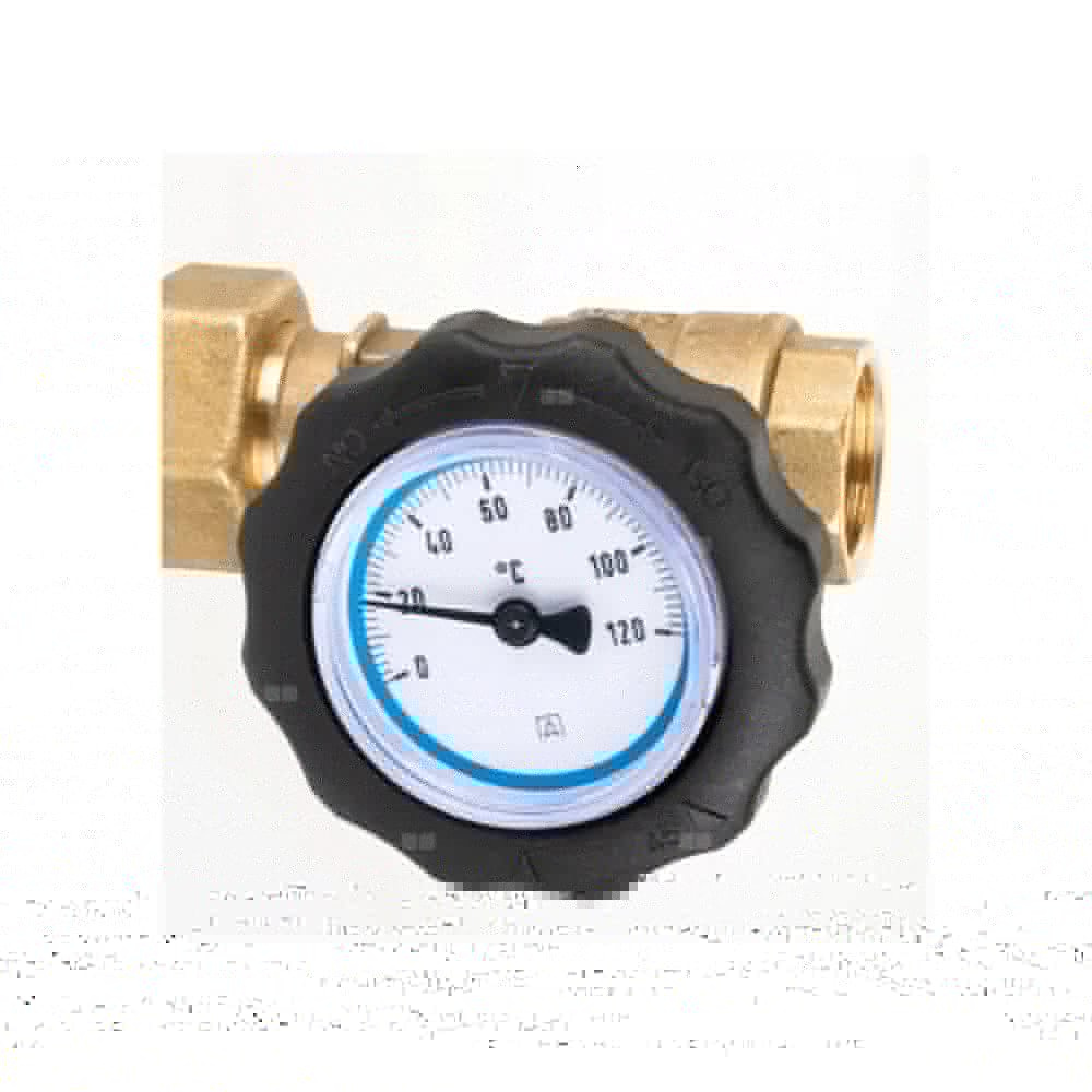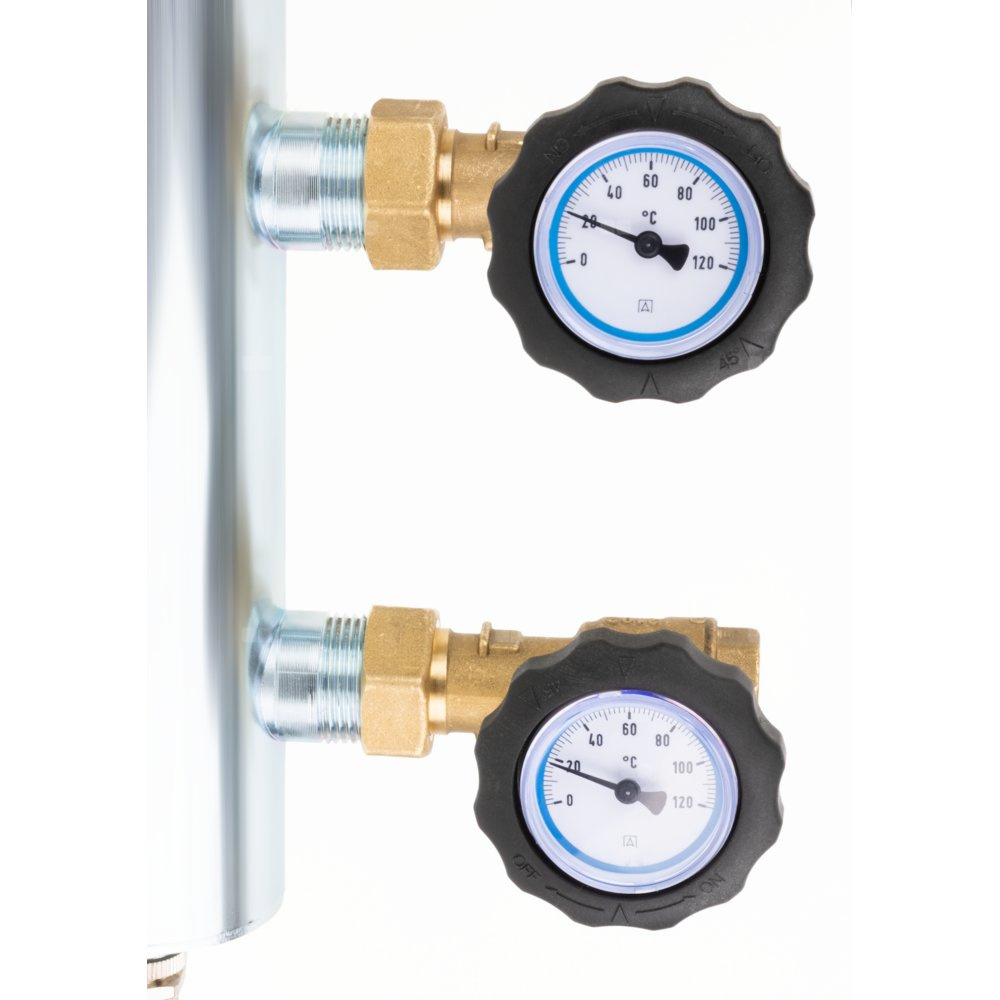 Zawory odcinające ze zintegrowanymi termometrami do kontroli temperatury medium na każdym przyłączu.