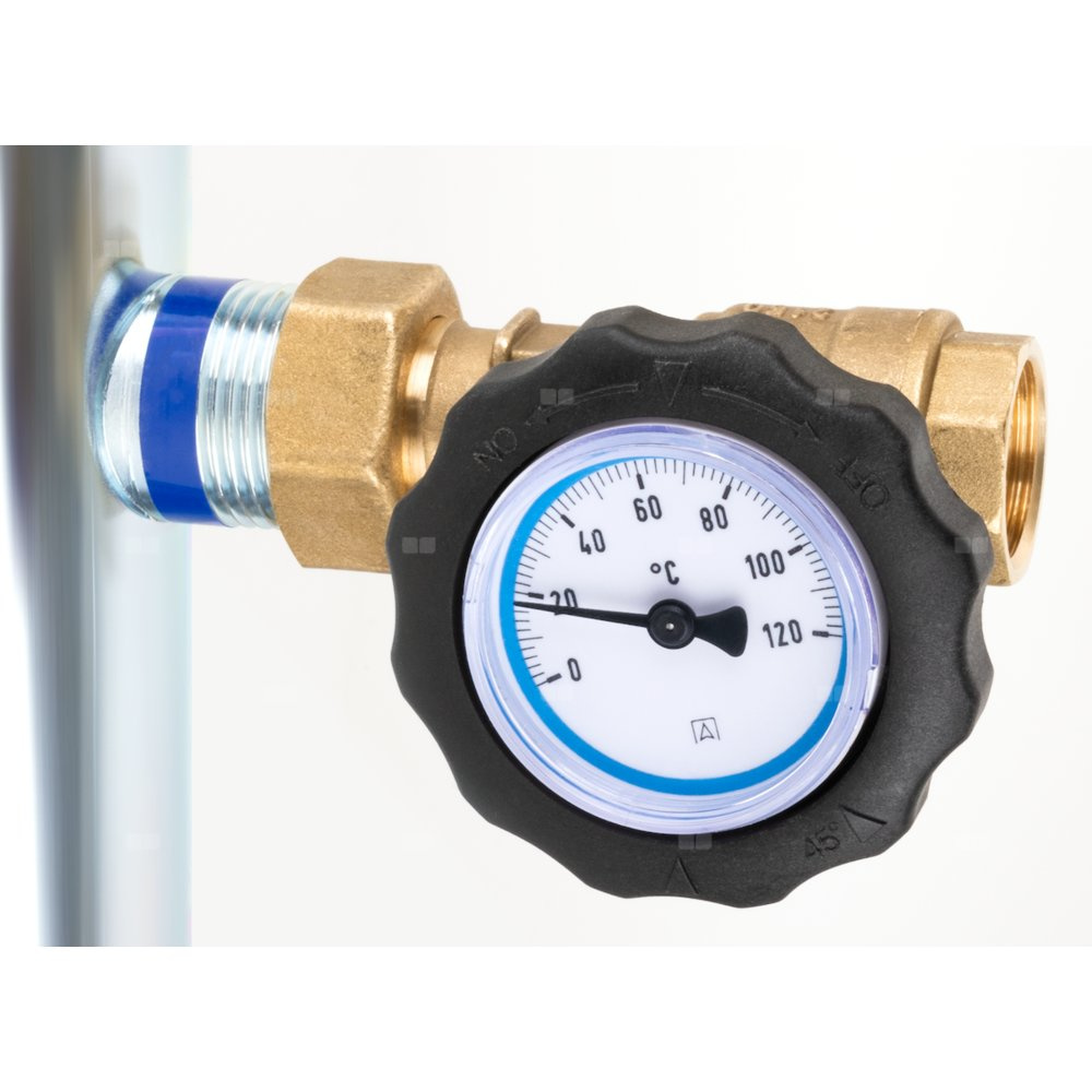 Zawór zwrotny wbudowany w zawór odcinający z niebieskim termometrem.