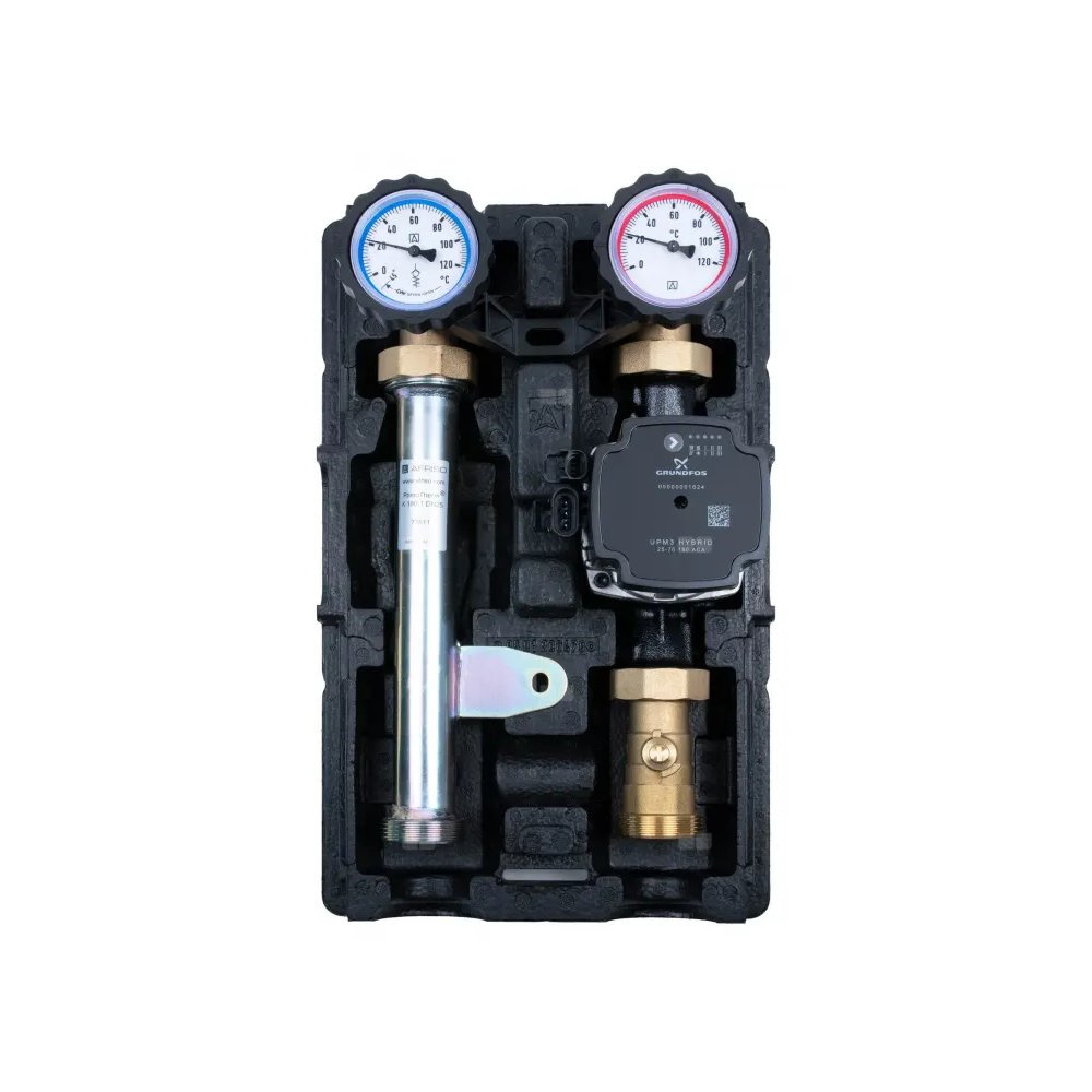 Wyposażona w niezbędne komponenty: termometry, zawór zwrotny, zawory odcinające na zasilaniu i powrocie, zawór odcinający przed pompą i izolację termiczną.