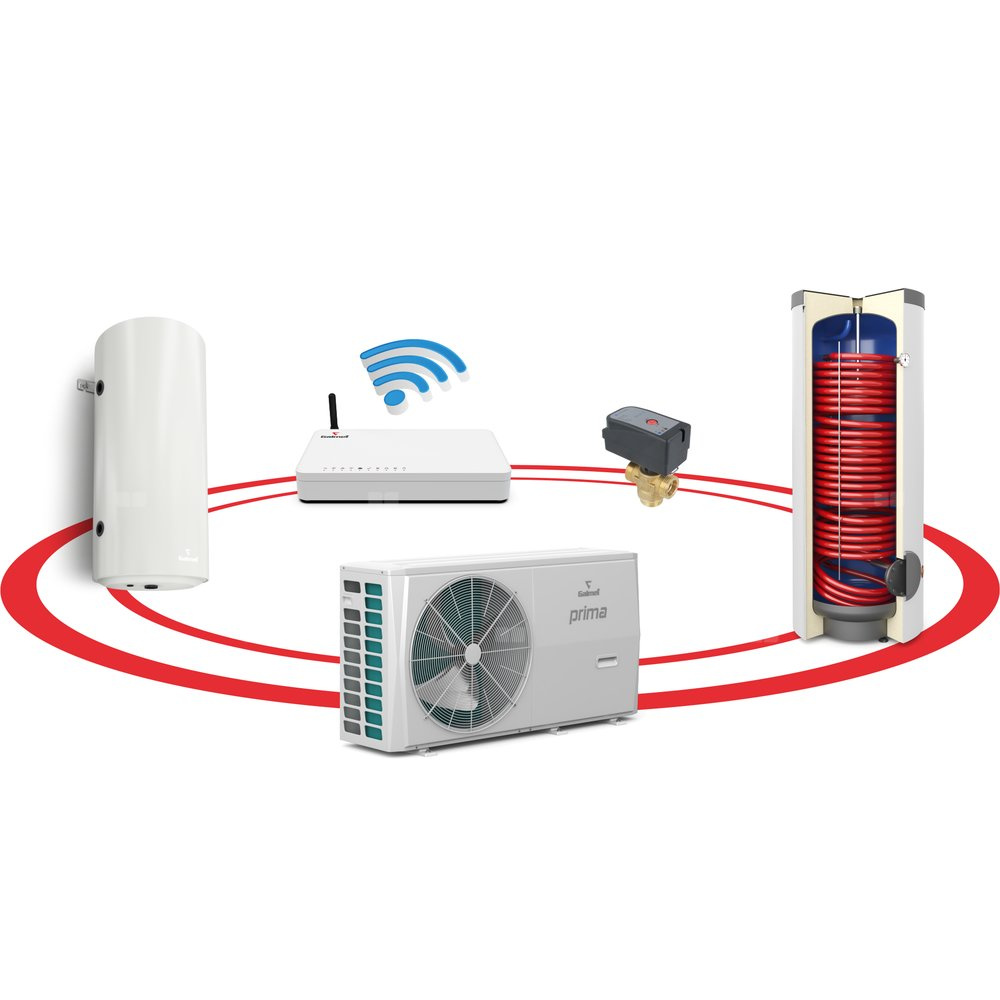 Hybrydowy system grzewczy: pompa ciepła PRIMA 1F R32 6GT (typu MONOBLOK) + wymiennik c.w.u. do pomp ciepła TOWER GRAND 200 l + bufor 60 l + zawór trójdrogowy + komplet elektryczny + centrala Sinum Lite