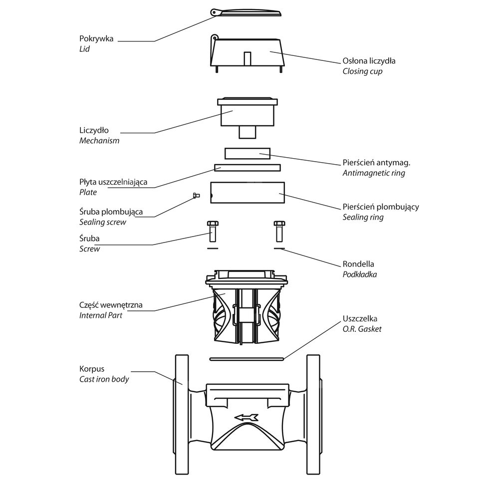 Wodomierz jednostrumieniowy suchobieżny przemysłowy, typu WDE-K50 DN 100 Q3=160 m3/h R250/160, Tmax: 50st.C, L=250 mm