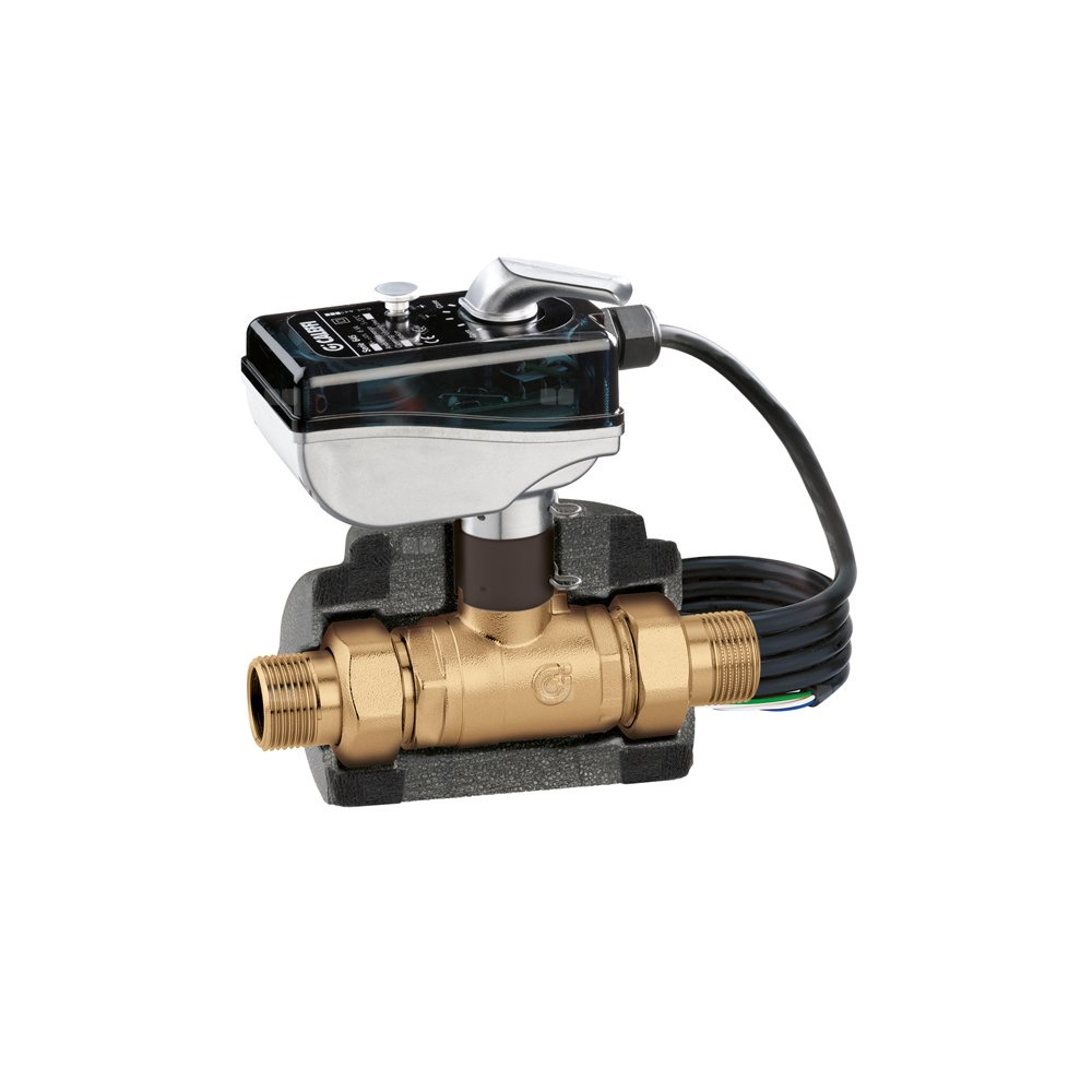Dwudrożny zawór kulowy z napędem do instalacji grzewczych i chłodniczych Z mikroprzełącznikiem pomocniczym Z dźwignią ręczną. Przyłącze: G 3/4" A (ISO 228-1) GZ. Maksymalne ciśnienie pracy: 10 bar. Zakres temperatury medium: -10–110 °C. Zakres temperatury otoczenia: -10–55 °C. Zasilanie elektryczne: 230 V (AC). Pobór mocy: 6 VA. Stopień ochrony: IP 65. Długość przewodu zasilająego: 0,8 m. Styk mikroprzełącznika pomocniczego (230 V): 6 (2) A. △p max.: 10 bar. Kv: 17,27 m³/h. Czas zadziałania: 50 s (obrót 90°).