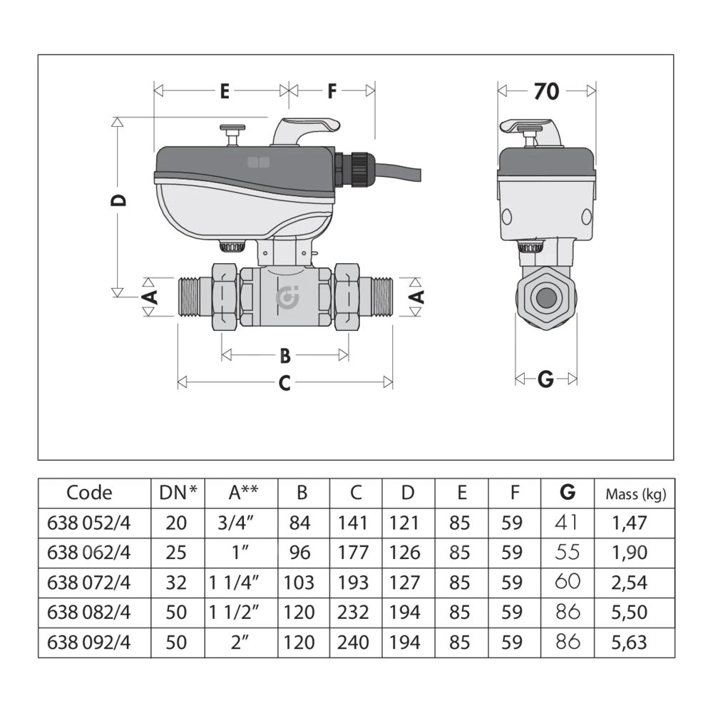 Dwudrożny zawór kulowy z napędem Z mikroprzełącznikiem pomocniczym. Przyłącze: R 1" (EN 10226-1) GZ. Maksymalne ciśnienie pracy: 16 bar. Zakres temperatury medium: -10–110 °C. Zakres temperatury otoczenia: -10–55 °C. Zasilanie elektryczne: 230 V (AC). Pobór mocy: 6 VA. Stopień ochrony: IP 65. Styk mikroprzełącznika pomocniczego (230 V): 6 (2) A. △p max.: 10 bar. Kv: 36,5 m³/h. Czas zadziałania: 50 s (obrót 90°).