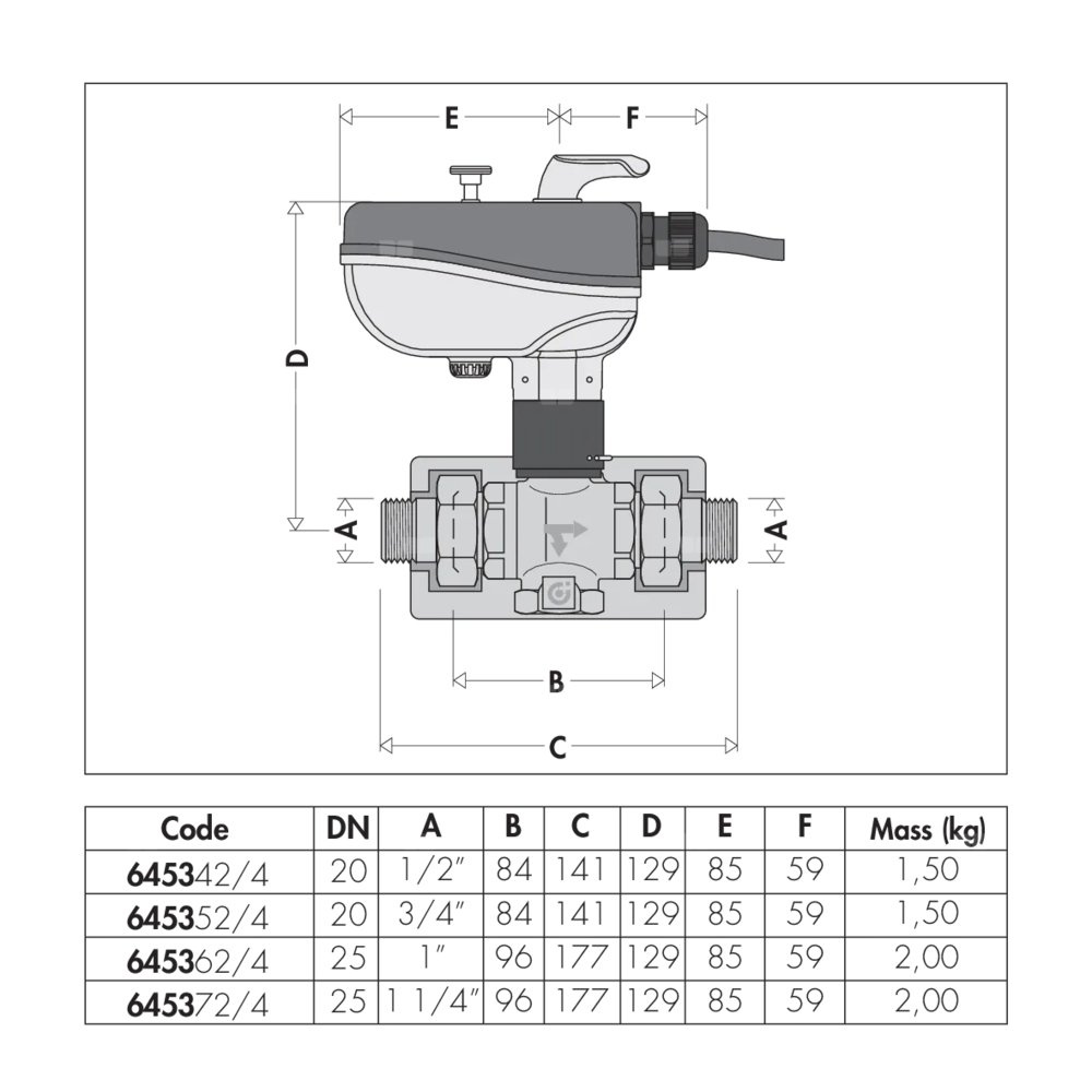 Trójdrożny zawór kulowy z napędem do instalacji grzewczych i chłodniczych Z mikroprzełącznikiem pomocniczym Z dźwignią ręczną. Przyłącze: G 1/2" A (ISO 228-1) GZ. Maksymalne ciśnienie pracy: 10 bar. Zakres temperatury medium: -10–110 °C. Zakres temperatury otoczenia: -10–55 °C. Zasilanie elektryczne: 230 V (AC). Pobór mocy: 6 VA. Stopień ochrony: IP 65. Długość przewodu zasilająego: 0,8 m. Styk mikroprzełącznika pomocniczego (230 V): 6 (2) A. △p max.: 10 bar. Kv przelot: 14,10 m³/h. Kv obejście: 2,45 m³/h. Czas zadziałania: 50 s (obrót 90°).