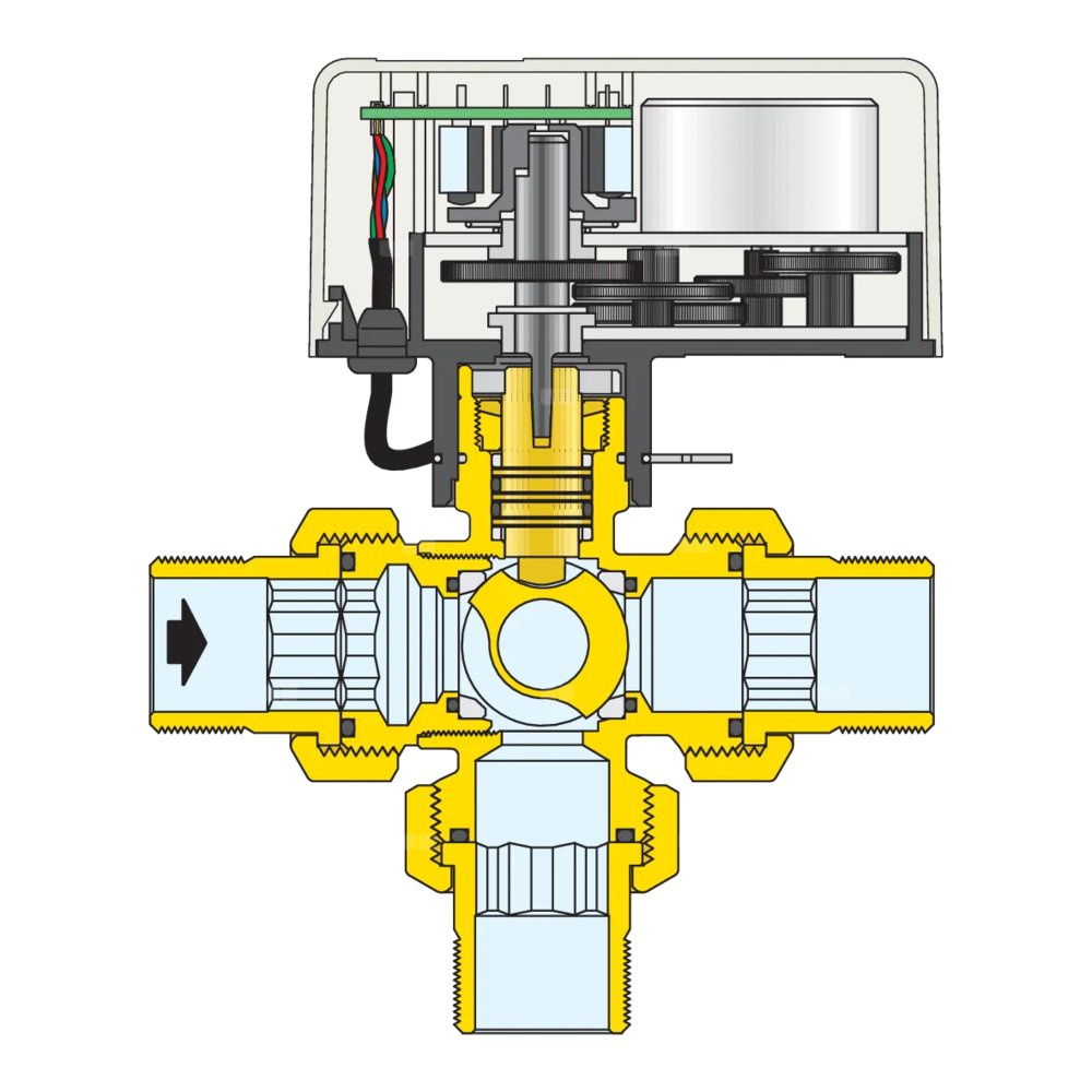 Trójdrożny kulowy zawór strefowy z napędem, wersja z obejściem Z mikroprzełącznikiem pomocniczym W zestawie z siłownikiem ze sterowaniem 3-punktowym Przyłącze: G 3/4" A (ISO 228-1) GZ. Maksymalne ciśnienie pracy: 10 bar. Zakres temperatury medium: -5–110 °C. Zakres temperatury otoczenia: 0–55 °C. Zasilanie elektryczne: 24 V (AC). Pobór mocy: 4 VA. Stopień ochrony: IP 40 (w pozycji poziomej), IP 44 (w pozycji pionowej). Długość przewodu zasilająego: 1 m. Styk mikroprzełącznika pomocniczego (230 V): 0,8 A. △p max.: 10 bar. Kv przelot: 10,3 m³/h. Kv obejście: 1,8 m³/h. Czas zadziałania: 40 s (obrót 90°).