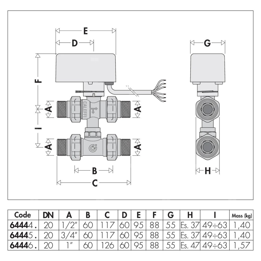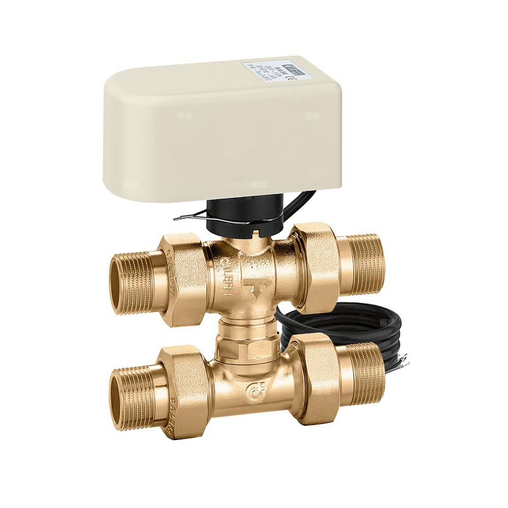 Trójdrożny zawór kulowy, z napędem z trójnikiem obejściowym Z mikroprzełącznikiem pomocniczym Z siłownikiem ze sterowaniem 3-punktowym Trójnik z dyszą U6. Regulowana odległość środkowych otworów wylotowych od 49 do 63 mm. Przyłącze: G 1/2" A (ISO 228-1) GZ. Maksymalne ciśnienie pracy: 10 bar. Zakres temperatury medium: -5–110 °C. Zakres temperatury otoczenia: 0–55 °C. Zasilanie elektryczne: 230 V (AC). Pobór mocy: 4 VA. Stopień ochrony: IP 44 (w pozycji pionowej), IP 40 (w pozycji poziomej). Długość przewodu zasilająego: 1 m. Styk mikroprzełącznika pomocniczego (230 V): 0,8 A. △p max.: 10 bar. Kv przelot: 10,3 m³/h. Kv obejście: 1,2 m³/h. Czas zadziałania: 40 s (obrót 90°).