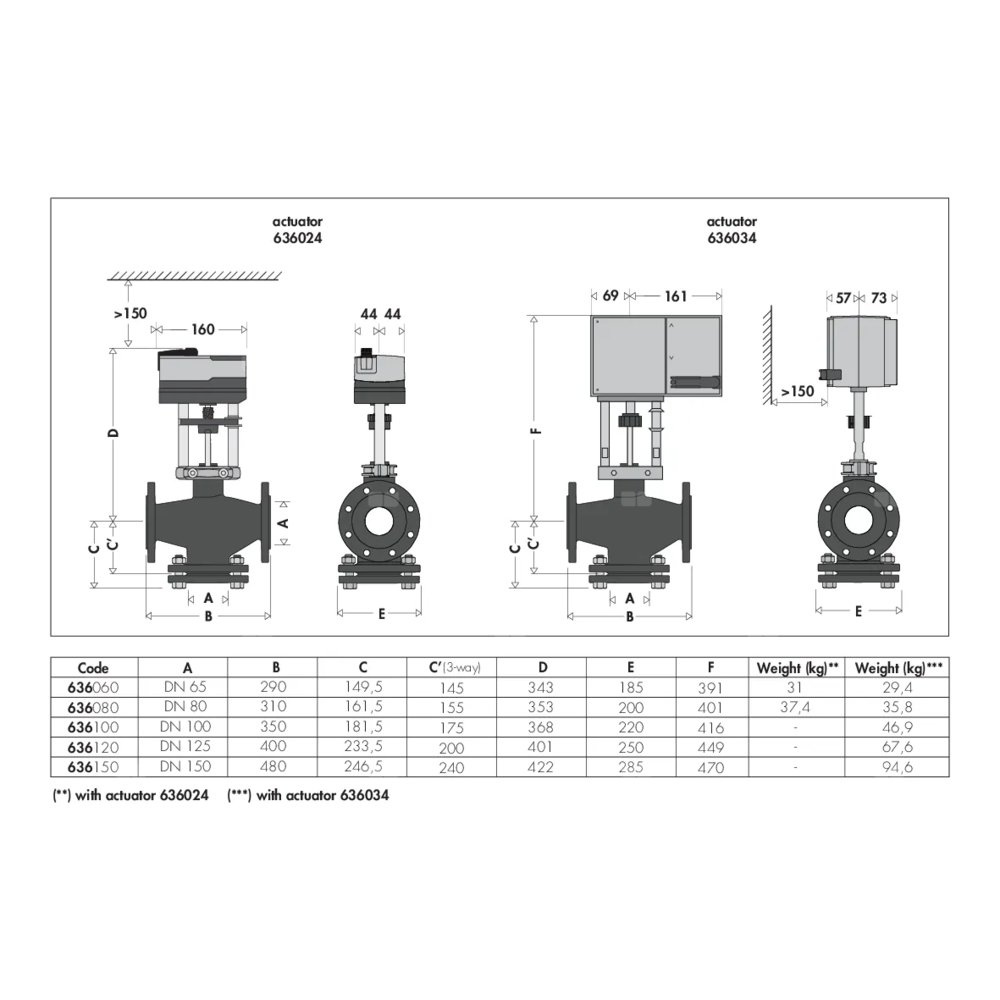 Dwudrożny/trójdrożny zawór regulacyjny, kołnierzowy Współpraca z przeciwkołnierzami EN 1092-1. Charakterystyka stałoprocentowa (dwudrożny). Charakterystyka stałoprocentowa/liniowa (trójdrożny). Zawór dwudrożny może zostać przekształcony do wersji trójdrożnej poprzez usunięcie elementu zaślepiającego by-pass. Przyłącze: DN 65 (EN 1092-1) PN 16. Maksymalne ciśnienie pracy: 16 bar. Zakres temperatury medium: 0–100 °C. PN (Ciśnienie nominalne): PN 16. Kv: 63 m³/h. Materiał: żeliwo.