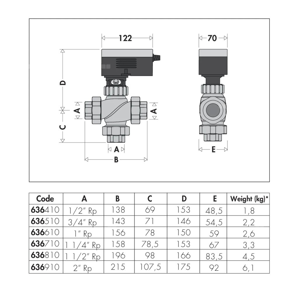 Trójdrożny zawór regulacyjny, gwintowany Charakterystyka stałoprocentowa. Przyłącze: Rp 1/2" (EN 10226-1) GW, złączka. Maksymalne ciśnienie pracy: 16 bar. Zakres temperatury medium: 0–100 °C. PN (Ciśnienie nominalne): PN 16. DN: DN 15 (korpus). Kv: 4 m³/h. Materiał: stop mosiądzu odporny na odcynkowanie.