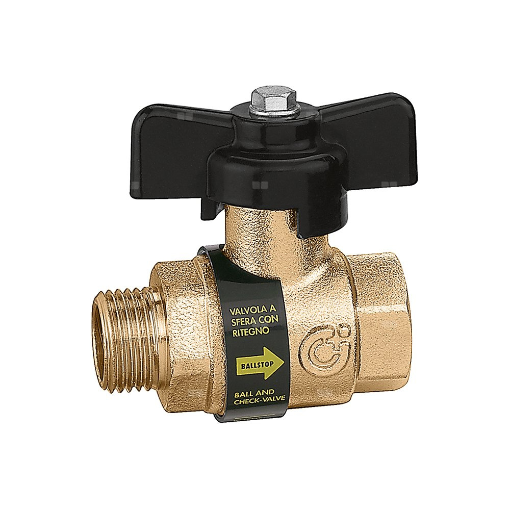 BALLSTOP - Zawór kulowy z wbudowanym zaworem zwrotnym z gwintem zewnętrzny i wewnętrznym. Pokrętło motylkowe 1/2" GZ x 1/2" GW