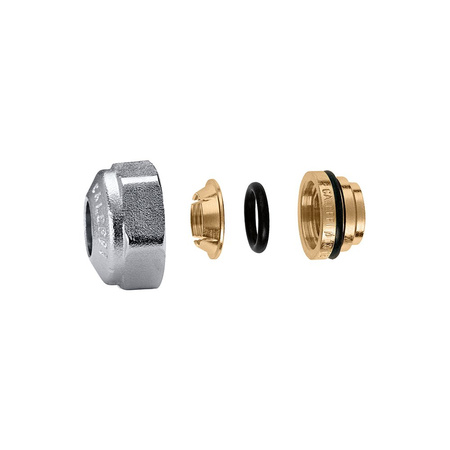 Złączka zaciskowa Z uszczelką O-ring. Przyłącze: 23 p.1,5, Podłączenie do złączek Caleffi. Przyłącze: Ø 10. Maksymalne ciśnienie pracy: 10 bar. Zakres temperatury medium: -25–120 °C. Wykończenie: chromowane. Materiał: mosiądz.