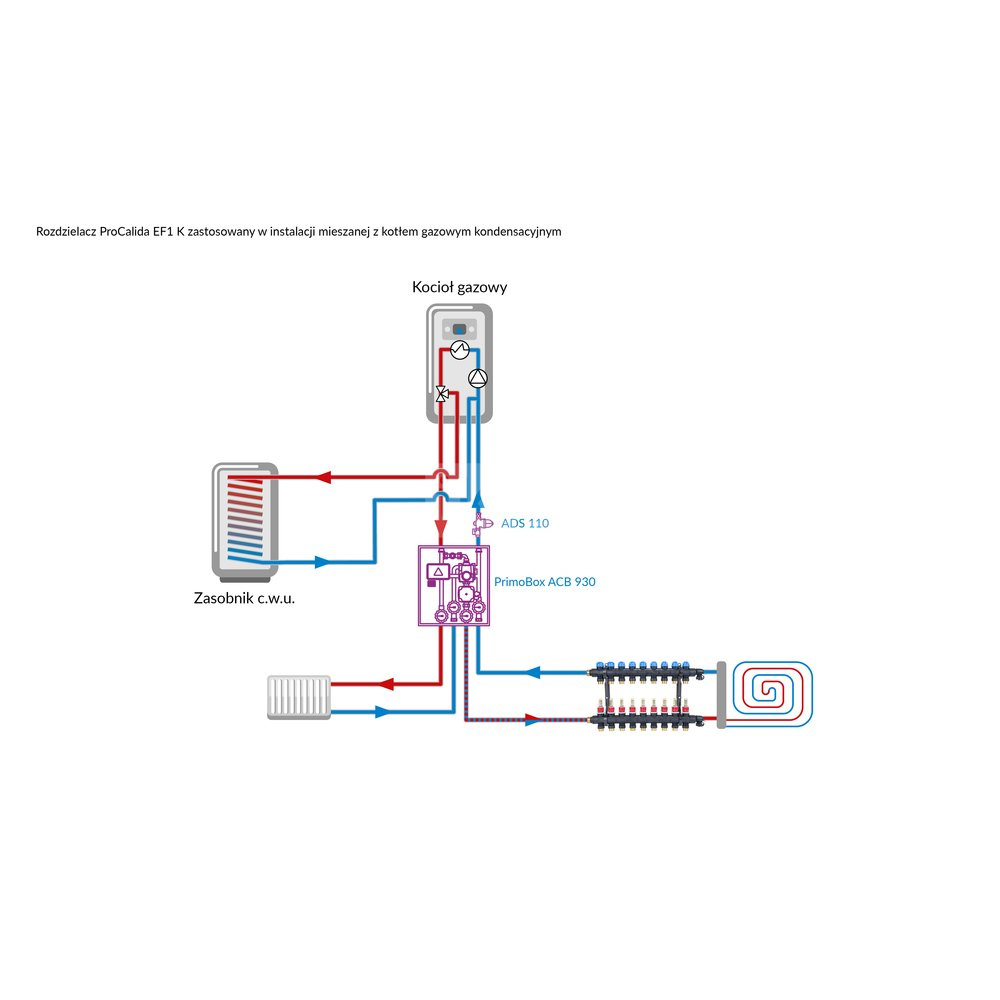 Stosowany w instalacjach płaszczyznowych grzewczych lub chłodzących.Montowany w szafce umieszczonej w ścianie / na ścianie budynku lub pod stropem w instalacjach sufitowych.