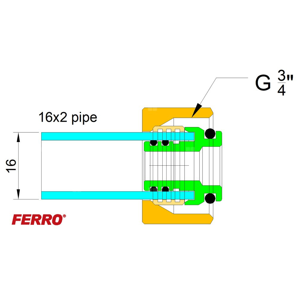 Złączka zaciskowa, skręcana do rur z tworzywa -wielowarstwowych. Złączka wykonana jest mosiądzu CW617N. Posiada O-ringi EPDEM. Zastosowanie do rur o rozmiarze DN16x2mm. Przyłącze 3/4'"