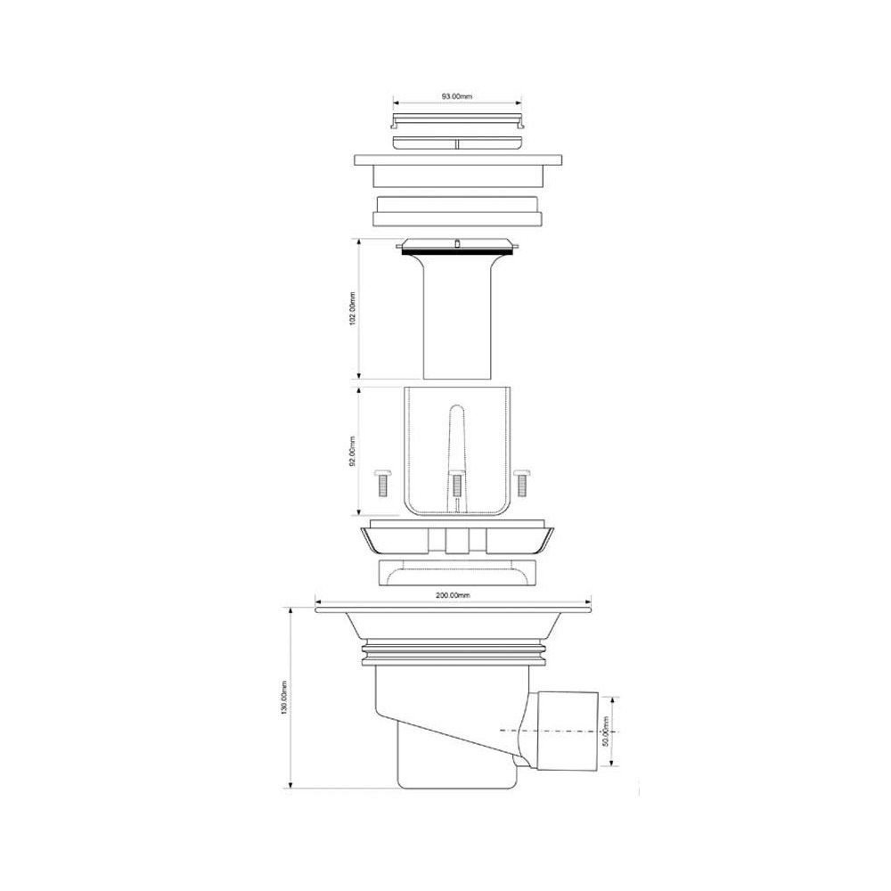 Wpust podłogowy wykonany z ABS z odpływem 50mm, czyszczony od góry z kratką ze stali nierdzewnej 150x150mm