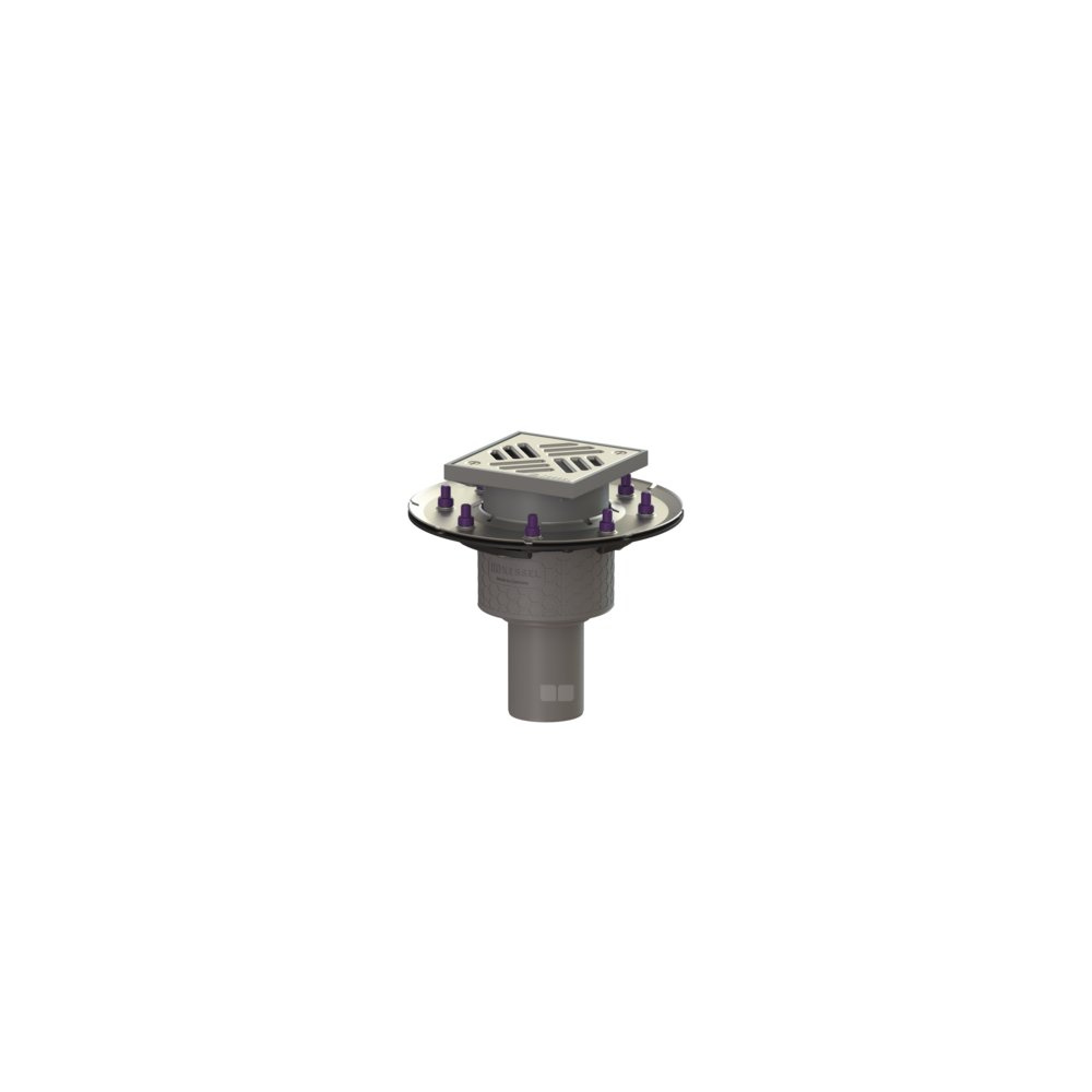 Wpust podłogowy/stropowy Practicus z tworzywa sztucznego służy do odwodnienia punktowego i jest wyposażony w dociskowy kołnierz uszczelniający oraz wyjmowany syfon, uszczelkę wargową i pokrywę ochronną na czas fazy budowlanej. Z nasadą z ABS z teleskopową regulacją wysokości. Wpust spełnia szczególne wymagania w zakresie izolacyjności akustycznej zgodnie z pomiarami Instytutu Frauenhofera w Stuttgarcie. Dociskowy kołnierz uszczelniający z bolcami i śrubami ze stali nierdzewnej służy do dociskania lub zgrzewania taśm bitumicznych i polimerowo-bitumicznych oraz taśm uszczelniających z tworzywa sztucznego i elastomerów. Do uszczelnień wodoszczelnych mogą być stosowane tylko sprawdzone przez producenta membrany hydroizolacyjne.