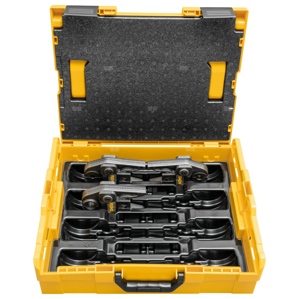 Zestaw cęgów zaciskowych REMS. Cęga zaciskowa REMS (PZ-2B) z 2 obrotowymi mono-blokowymi szczękami. O dużej obciążalności z kutej, ciągliwo-twardej i odpowiednio hartowanej stali specjalnej. Kontury zaciskowe są specyficzne dla każdego systemu i odpowiadają konturom poszczególnych systemów zaciskowych. Zapewnia to bezproblemową zgodność i pewne zaciskanie. Napęd przez prasy promieniowe REMS 32 kN i odpowiednie prasy promieniowe innych producentów o sile posuwu 32 kN. Cęgi wyposażono dodatkowo w złącze umożliwiające mocowanie ręcznego napędu prasy promieniowej REMS Eco-Press. W skrzynce systemowej L-Boxx.