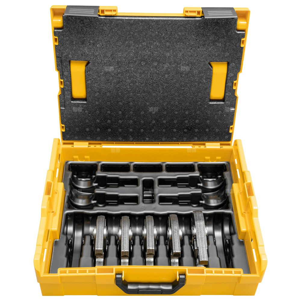 Zestaw cęgów zaciskowych REMS Mini. Cęga zaciskowa REMS Mini (PZ-2B) z 2 obrotowymi mono-blokowymi szczękami. Wyjątkowo kompaktowe i lekkie cęgi zaciskowe REMS Mini dzięki specjalnemu umiejscowieniu przyłącza cęgów zaciskowych (patent EP 1 952 948). Wpuszczone w szczęki zaciskowe zagłębienia do pewnego prowadzenia łączników zapewniające zaciskanie bez przesunięć (patent EP 2 347 862). O dużej obciążalności z kutej, ciągliwo twardej i odpowiednio hartowanej stali specjalnej. Kontury zaciskowe są specyficzne dla każdego systemu i odpowiadają konturom poszczególnych systemów zaciskowych. Zapewnia to bezproblemową zgodność i pewne zaciskanie. Napęd przez wszystkie prasy promieniowe REMS 22kN. W skrzynce systemowej L-Boxx.