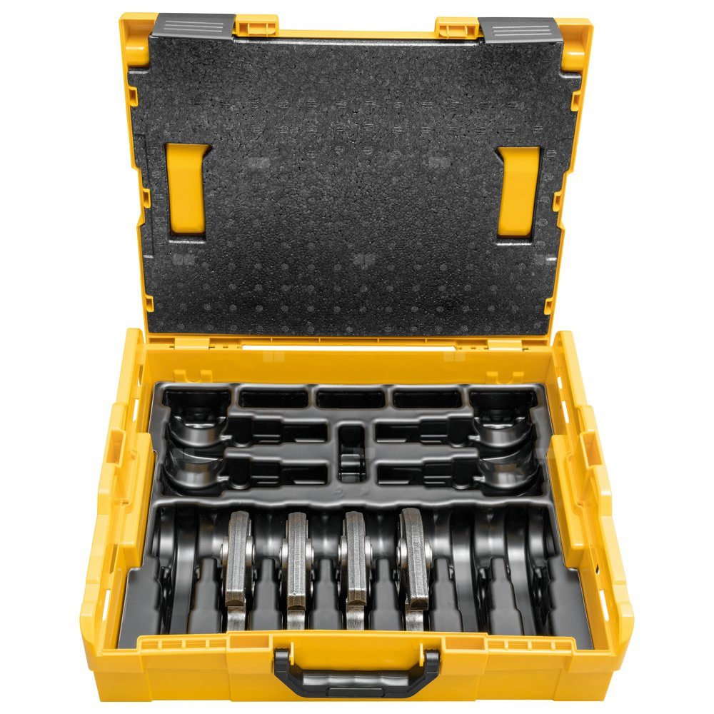 Zestaw cęgów zaciskowych REMS Mini. Cęga zaciskowa REMS Mini (PZ-2B) z 2 obrotowymi mono-blokowymi szczękami. Wyjątkowo kompaktowe i lekkie cęgi zaciskowe REMS Mini dzięki specjalnemu umiejscowieniu przyłącza cęgów zaciskowych (patent EP 1 952 948). Wpuszczone w szczęki zaciskowe zagłębienia do pewnego prowadzenia łączników zapewniające zaciskanie bez przesunięć (patent EP 2 347 862). O dużej obciążalności z kutej, ciągliwo twardej i odpowiednio hartowanej stali specjalnej. Kontury zaciskowe są specyficzne dla każdego systemu i odpowiadają konturom poszczególnych systemów zaciskowych. Zapewnia to bezproblemową zgodność i pewne zaciskanie. Napęd przez wszystkie prasy promieniowe REMS 22kN. W skrzynce systemowej L-Boxx.