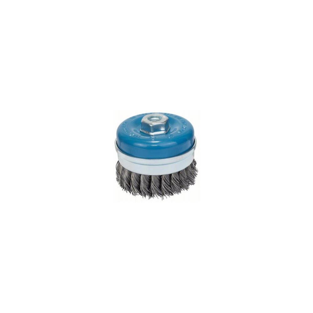 Tekst produktu, osprzęt szary Szczotka druciana garnkowa, drut pleciony Odpowiednia do wysokowydajnego czyszczenia od średnich do dużych powierzchni metalowych, np. usuwania silnej korozji, powłok antykorozyjnych, farb i lakierów. Odpowiednia do wszystkich szlifierek kątowych z gwintem M14 i szlifierek GGS 6 S Professional