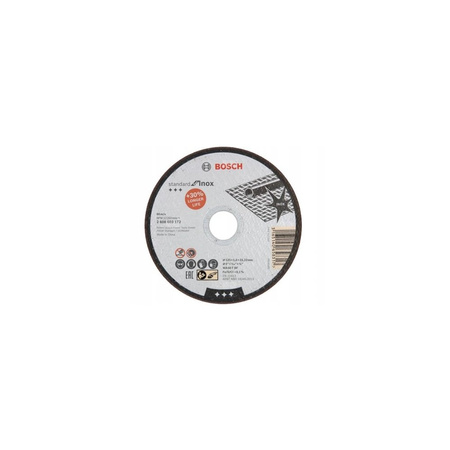 Tarcza tnąca Standard for Inox to niezawodne narzędzie do obróbki stali Inox. Wykonana z tlenku glinu tarcza została specjalnie zaprojektowana do obróbki stali Inox. Nie zawiera żelaznych, siarkowych ani chlorowych wypełniaczy. Tarcza przystosowana do cięcia stali Inox. Pasuje do szlifierek kątowych marki Bosch.