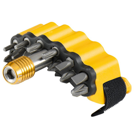 Zestaw bitów, składający się z magnetycznego szybkowymiennego uchwytu bitów, z automatyczną blokadą bitu, 12 bitów (4 Torx, 3 krzyżowe PH, 3 krzyżowe PZ, 2 płaskie), w praktycznym magazynku z elastyczną taśmą mocującą do zamocowania na przegubie ręki lub na wkrętarko-wiertarce.