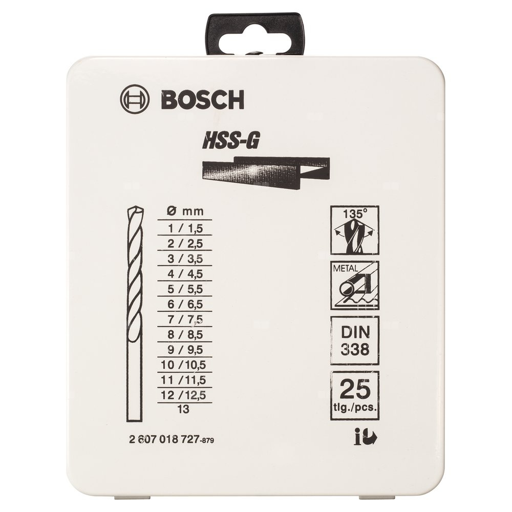 Tekst produktu, osprzęt, szary 25-częściowy zestaw wierteł do metalu HSS-G, DIN 338, 135°, w metalowej kasecie