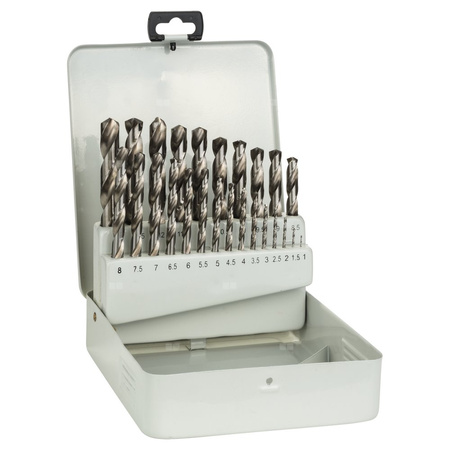 Opis zestawu 25-elem. zestaw wierteł do metalu HSS-G, DIN 338, 135° w metalowej kasecie Średnice (mm): 1; 1,5; 2; 2,5; 3; 3,5; 4; 4,5; 5; 5,5; 6; 6,5; 7; 7,5; 8; 8,5; 9; 9,5; 10; 10,5; 11; 11,5; 12; 12,5; 13 Długości robocze (mm): 12; 18; 24; 30; 33; 39; 43; 47; 52; 57; 57; 63; 69; 69; 75; 75; 81; 81; 87; 87; 94; 94; 101; 101; 101
