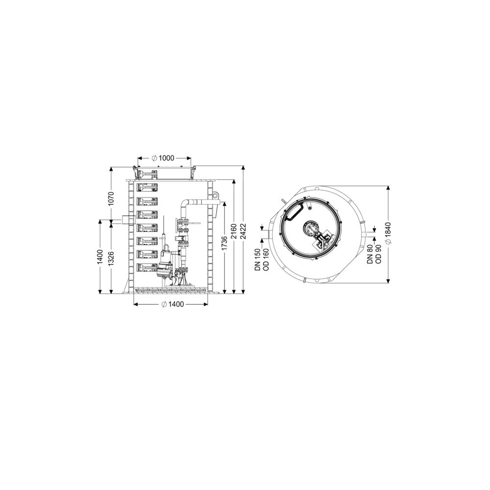 - Odstęp między środkiem rury dopływowej a dnem zbiornika: 1400 mm