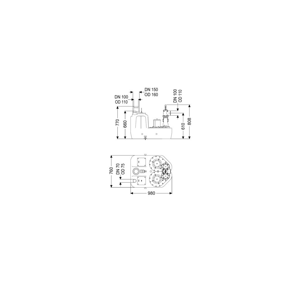 Przepompownia do ścieków zawierających fekalia i bez fekaliów jjest wyposażony w jedną lub dwie pompy zatapialną oraz zawór zwrotny. Pojemnik zbiorczy wykonany z wytrzymałego tworzywa sztucznego (PE) oferuje uniwersalne możliwości podłączenia i posiada przykręcany otwór wyczystkowy.