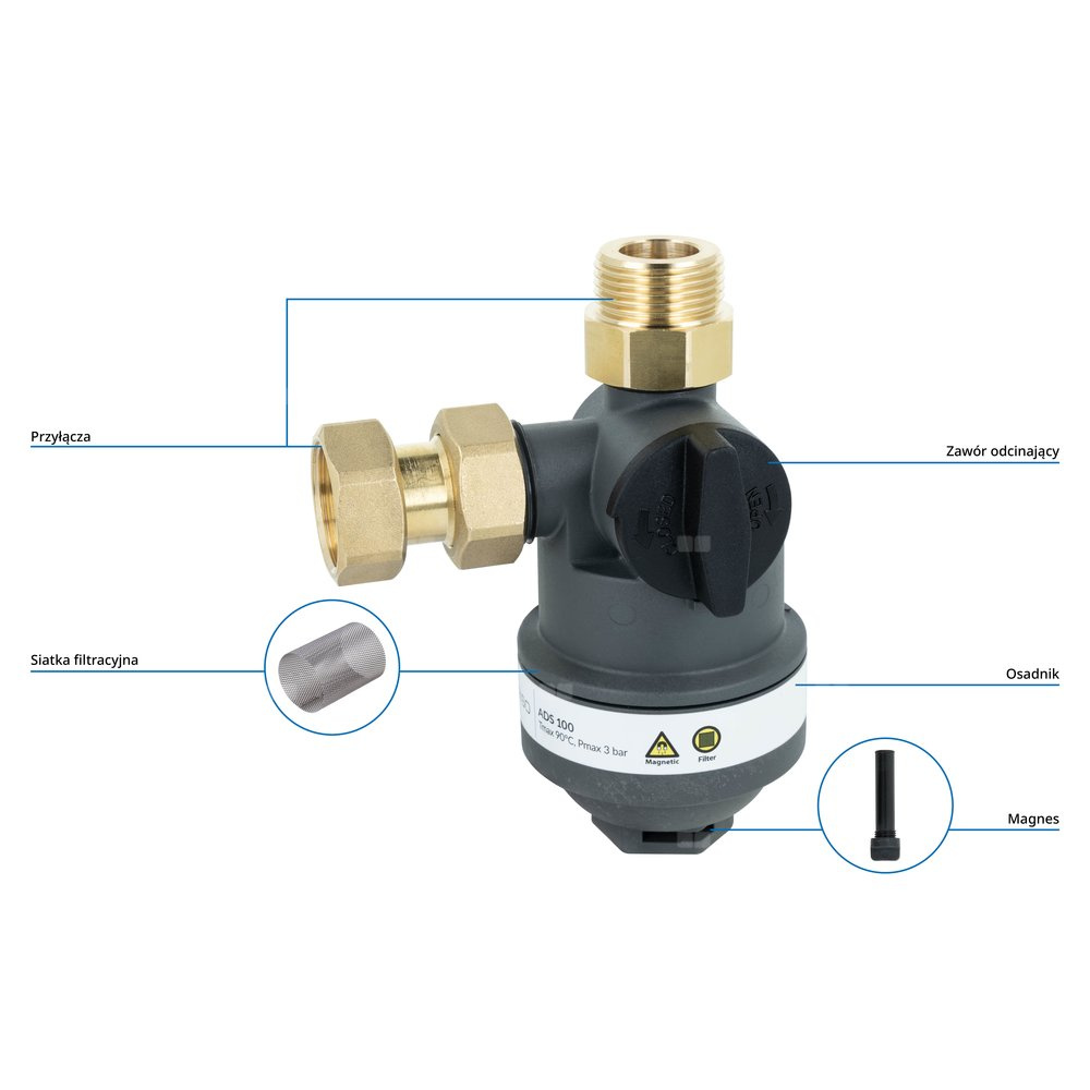 Stosowany w instalacjach grzewczych i chłodzących.Montowany przed źródłem ciepła na powrocie z instalacji.
