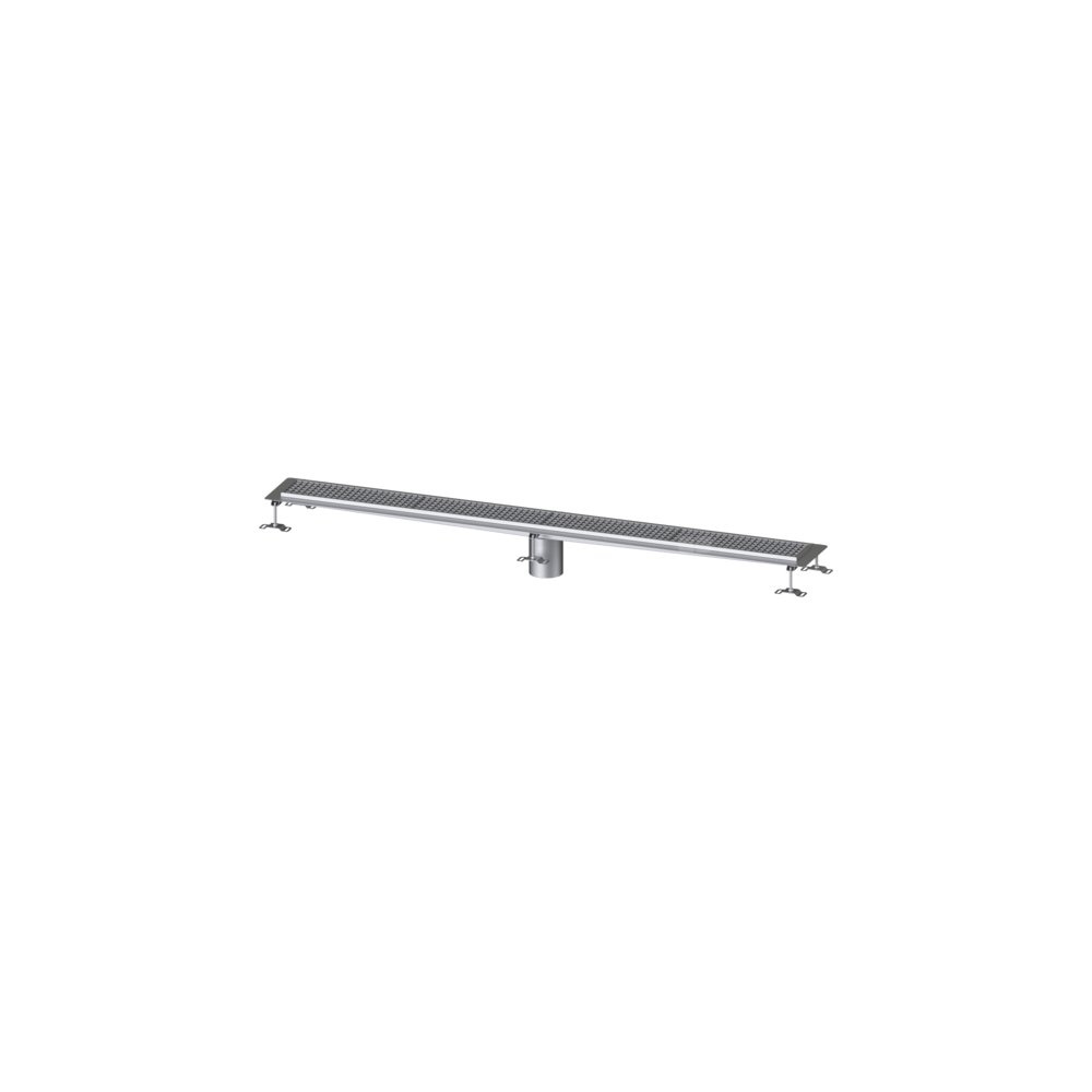 Odpływ szczelinowy Ferrofix z blachy ze stali nierdzewnej o grubości 2,0 mm (wytrawiany zanurzeniowo) posiada widoczne elementy szlifowane, spadek podłużny i poprzeczny, nóżki do poziomowania wysokości, dospawane poprzeczki dystansowe do zabezpieczenia rusztów oraz króciec odpływowy ze stali nierdzewnej.