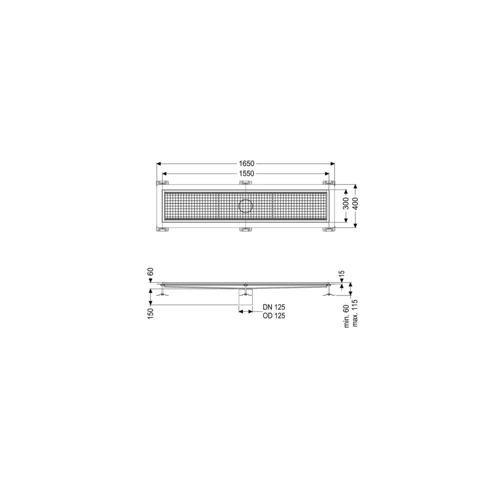 Odpływ szczelinowy Ferrofix z blachy ze stali nierdzewnej o grubości 2,0 mm (wytrawiany zanurzeniowo) posiada widoczne elementy szlifowane, spadek podłużny i poprzeczny, nóżki do poziomowania wysokości, dospawane poprzeczki dystansowe do zabezpieczenia rusztów oraz króciec odpływowy ze stali nierdzewnej.