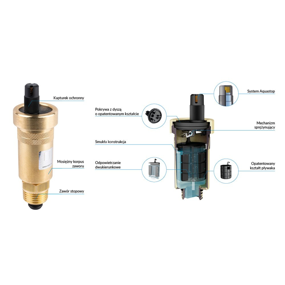 Zawór stopowy umożliwia łatwą wymianę i konserwację odpowietrznika bez konieczności spuszczania medium z instalacji.