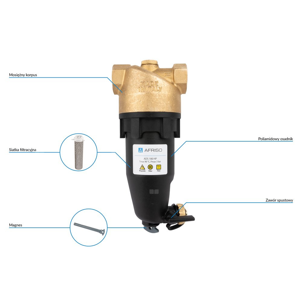 Separator AFRISO ADS 180 HP, do C.O., do klimatyzacji, 3 bar / 90'C, 1'' (GW), z wkładem magnesowymInstalacje i źródła ciepła
