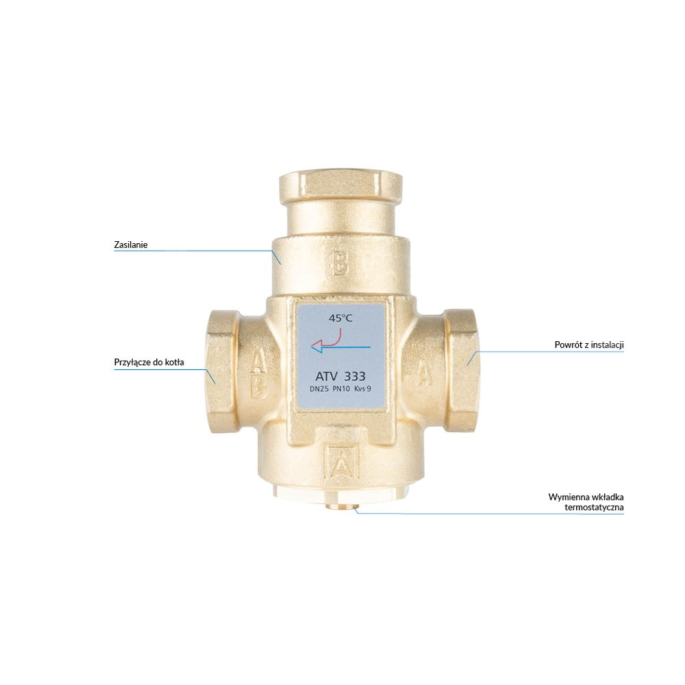W instalacjach z kotłami stałopalnymi miesza lub rozdziela strumień medium. W przypadku funkcji mieszania ATV zabezpiecza kocioł przed korozją niskotemperaturową na skutek powrotu wody o zbyt niskiej temperaturze. W przypadku funkcji rozdzielania ATV rozdziela medium między powrotem do kotła a zasilaniem instalacji, umożliwiając wygrzanie kotła do odpowiedniej temperatury.