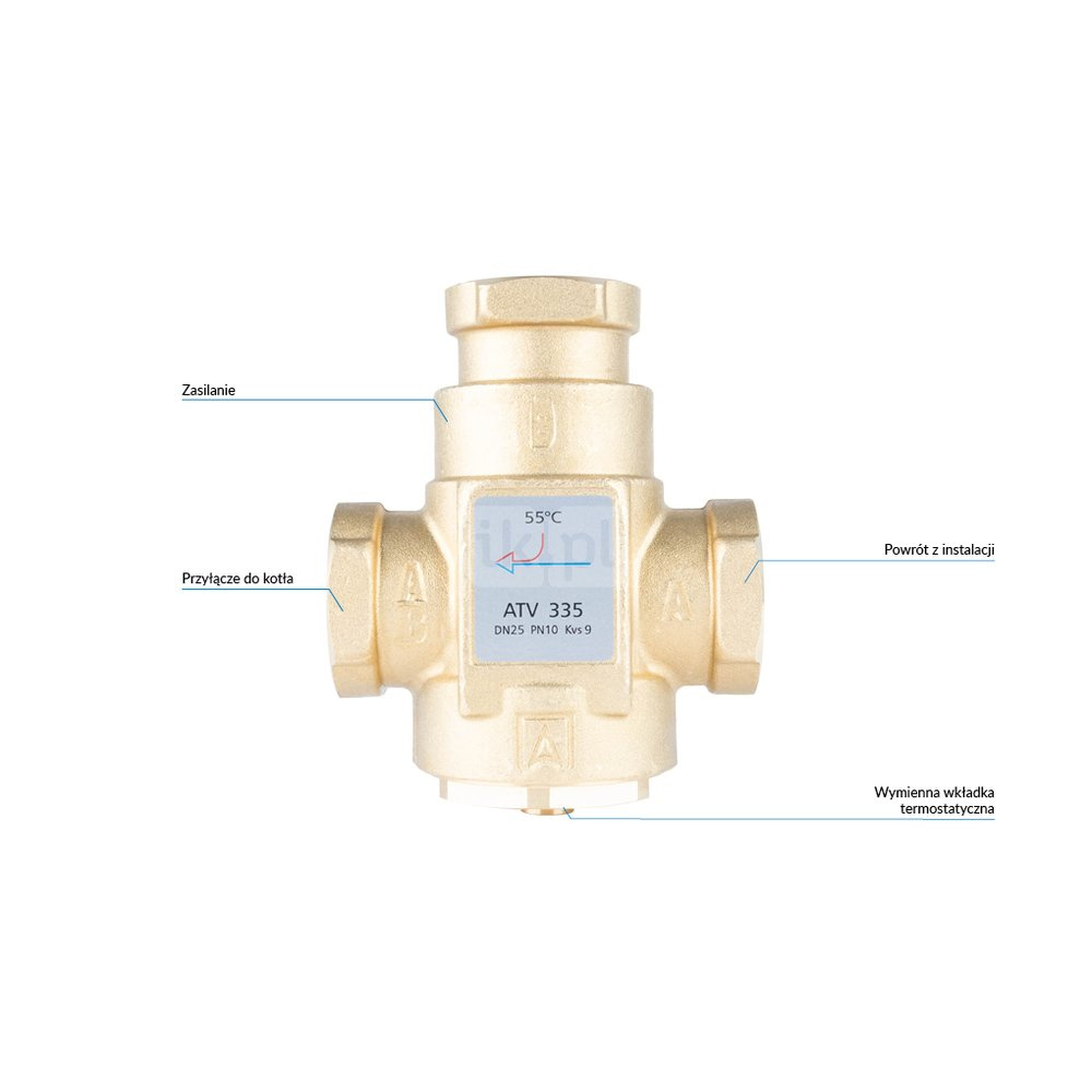 W instalacjach z kotłami stałopalnymi miesza lub rozdziela strumień medium. W przypadku funkcji mieszania ATV zabezpiecza kocioł przed korozją niskotemperaturową na skutek powrotu wody o zbyt niskiej temperaturze. W przypadku funkcji rozdzielania ATV rozdziela medium między powrotem do kotła a zasilaniem instalacji, umożliwiając wygrzanie kotła do odpowiedniej temperatury.