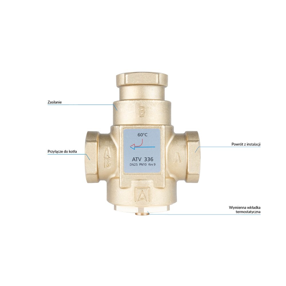 W instalacjach z kotłami stałopalnymi miesza lub rozdziela strumień medium. W przypadku funkcji mieszania ATV zabezpiecza kocioł przed korozją niskotemperaturową na skutek powrotu wody o zbyt niskiej temperaturze. W przypadku funkcji rozdzielania ATV rozdziela medium między powrotem do kotła a zasilaniem instalacji, umożliwiając wygrzanie kotła do odpowiedniej temperatury.