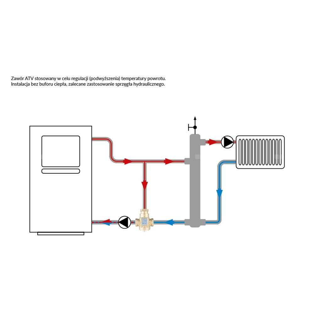 W instalacjach z kotłami stałopalnymi miesza lub rozdziela strumień medium. W przypadku funkcji mieszania ATV zabezpiecza kocioł przed korozją niskotemperaturową na skutek powrotu wody o zbyt niskiej temperaturze. W przypadku funkcji rozdzielania ATV rozdziela medium między powrotem do kotła a zasilaniem instalacji, umożliwiając wygrzanie kotła do odpowiedniej temperatury.