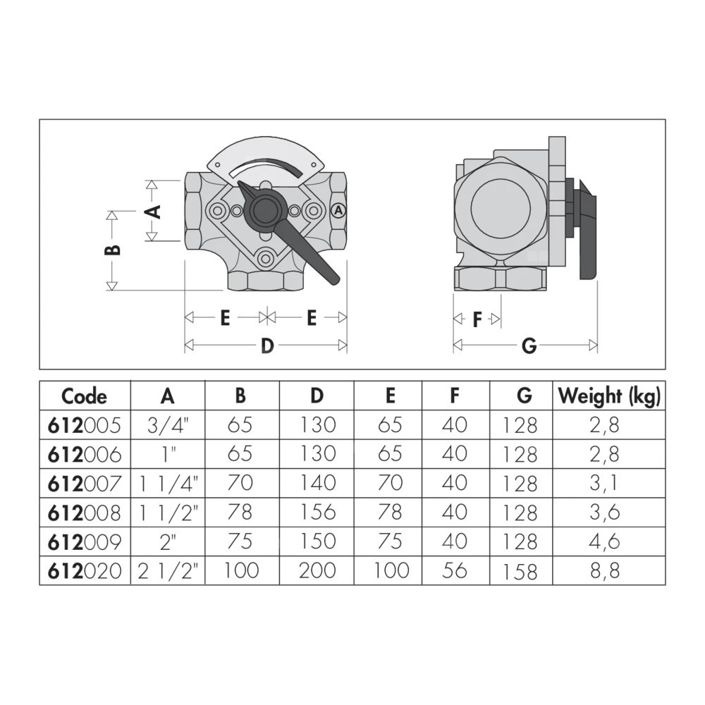 Zawór trójdrogowy mieszający. Przyłącza gwintowane Ustawienie fabryczne: zasilanie ze źródła ciepła z prawej strony. Do stosowania w ciężkich warunkach. Przyłącze: G 1 1/2" (ISO 228-1) GW. Maksymalne ciśnienie pracy: 6 bar. Zakres temperatury medium: 2–110 °C. Kv: 30 m³/h.