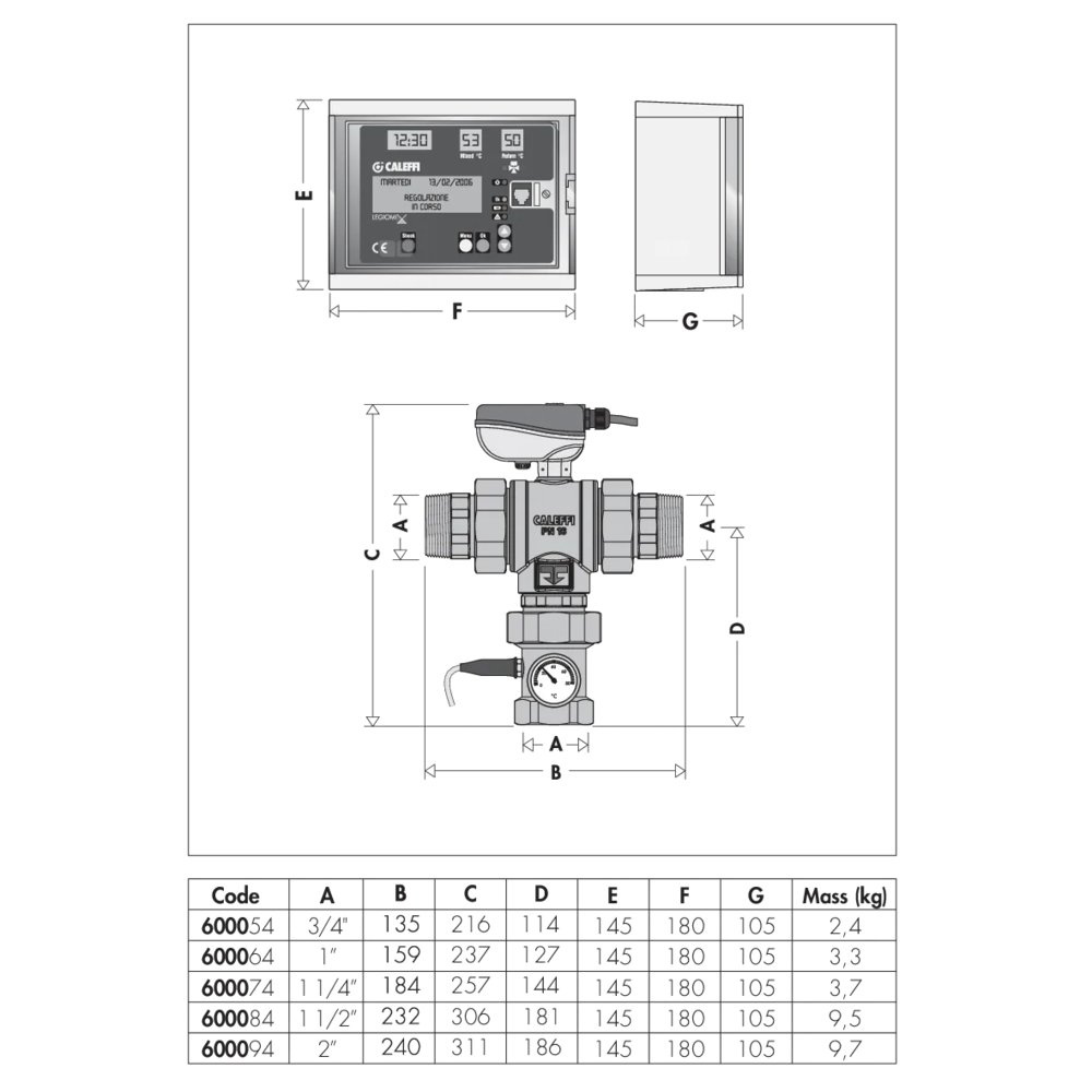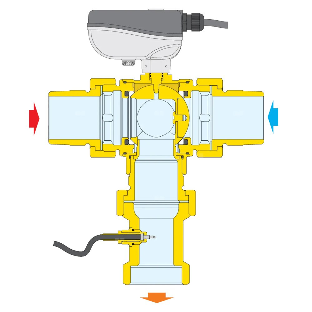 Elektroniczny zawór mieszający z programowalną dezynfekcją termiczną i dezynfekcją kontrolną 24 V. Przyłącza z gwintem zewnętrznym ze złączkami. Z mikroprzełącznikiem pomocniczym Zawiera: - trójdrożny zawór kulowy, - siłownik, - regulator, - czujnik temperatury wody zmieszanej, - czujnik temperatury wody cyrkulacyjnej. Możliwość zdalnego sterowania za pomocą protokołów RS-485 i MODBUS-RTU. Przyłącze: R 1" (EN 10226-1) GZ, wlot, złączka. Przyłącze: G 1" (ISO 228-1) GW, wylot. Maksymalne ciśnienie pracy: 10 bar. Zakres temperatury medium: 0–100 °C. Zakres regulacji temperatury: 20–85 °C. Zakres temperatury dezynfekcji: 40–85 °C. Zasilanie elektryczne: 24 V (AC). Pobór mocy: (6,5+6) VA. Stopień ochrony: IP 65. Kv: 10,6 m³/h.
