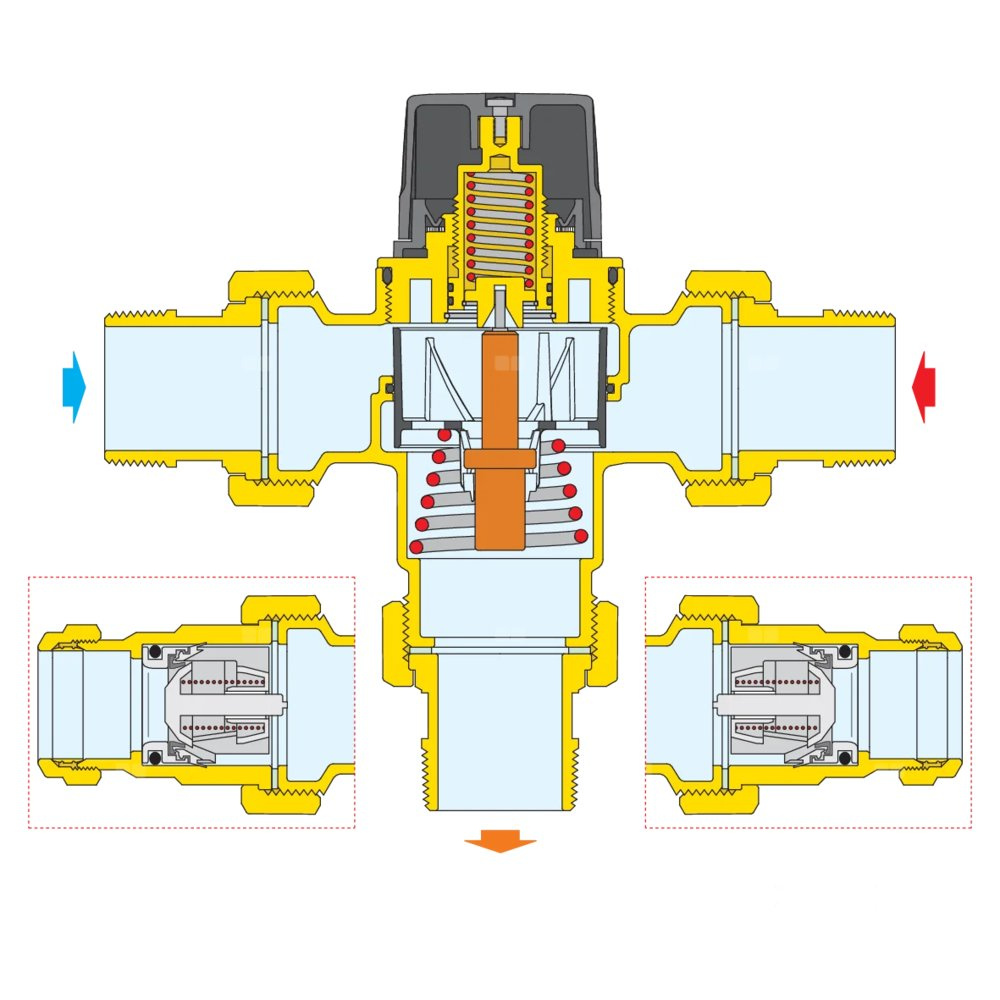 Regulowany termostatyczny zawór mieszający do systemów scentralizowanych. Korpus wykonany ze stopu odpornego na wypłukiwanie cyn