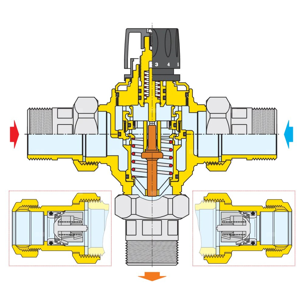Regulowany termostatyczny zawór mieszający z wymiennym wkładem do systemów scentralizowanych Przyłącze: G 1 1/2" A (ISO 228-1) GZ. Maksymalne ciśnienie pracy: 14 bar. Zakres temperatury medium: 2–85 °C. Zakres regulacji temperatury: 36–65 °C. Kv: 14,5 m³/h. Materiał: mosiądz.