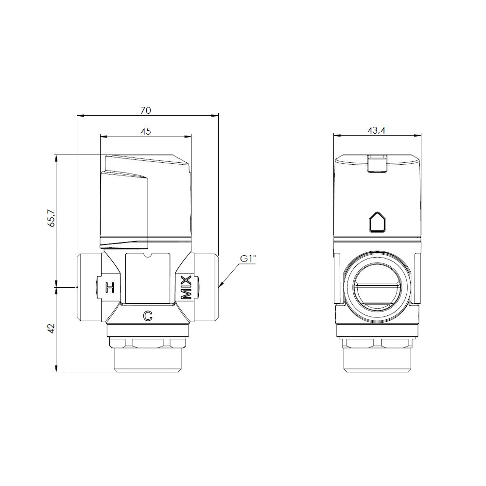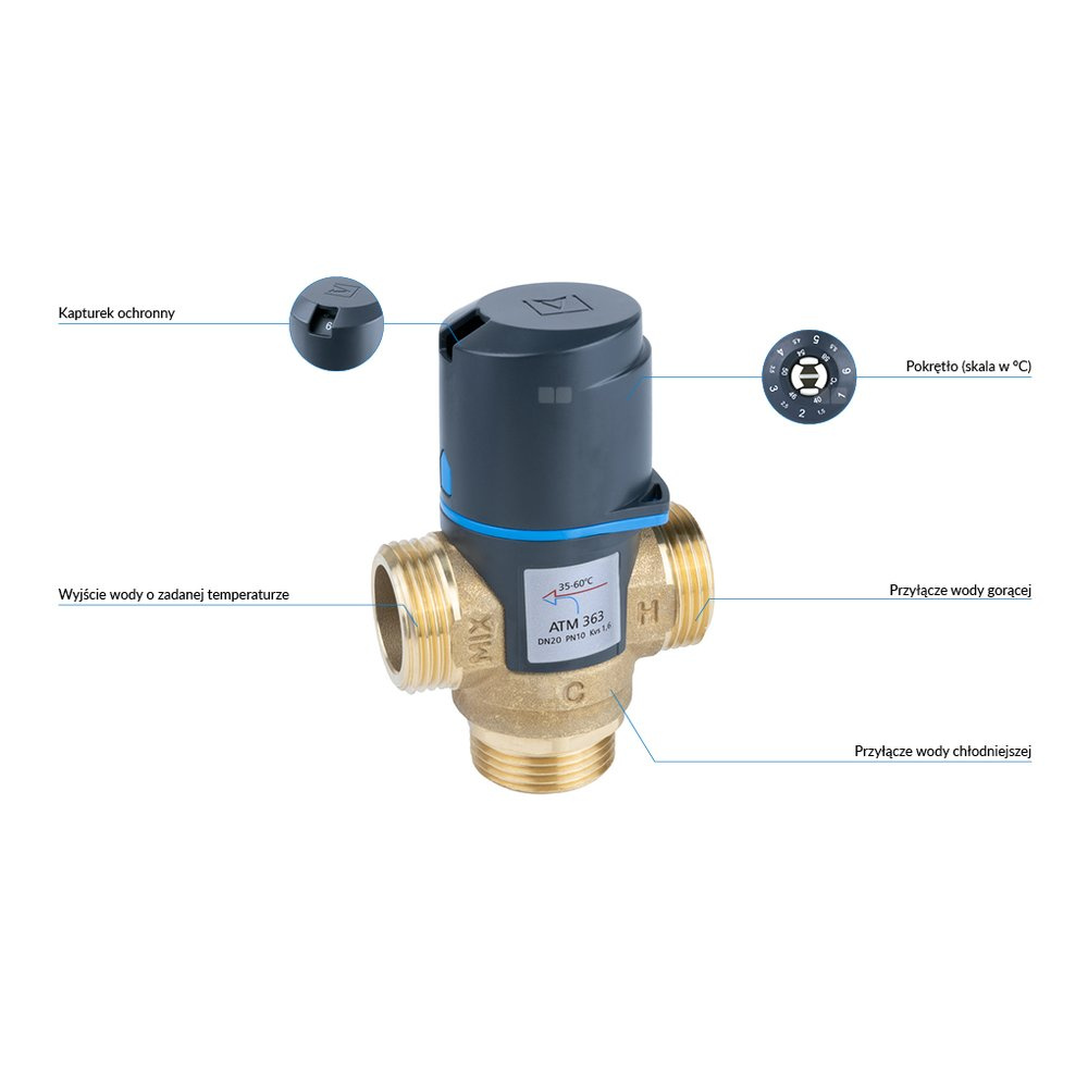 Zawór regulacyjny termostatyczny do wody ciepłej AFRISO ATM 363 mosiądz GZ 1'', DN 20, zakres temp. 35-60'C, Kvs 1.6 m3/h, maksymalna temperatura 90'C, maksymane ciśnienie 10 bar